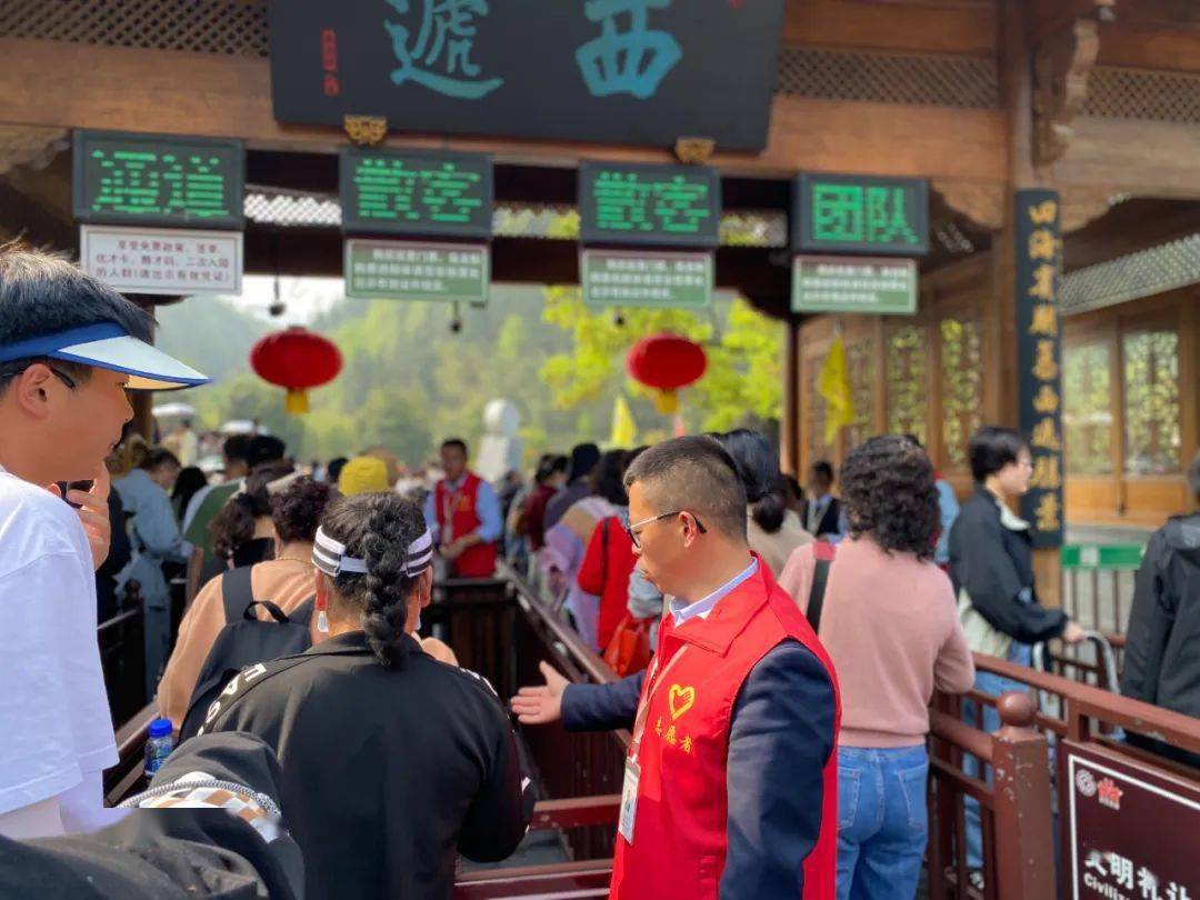 ▲黄山风景区迎客松志愿者为 为游客指引路线