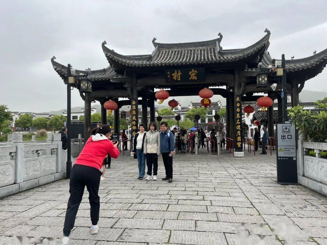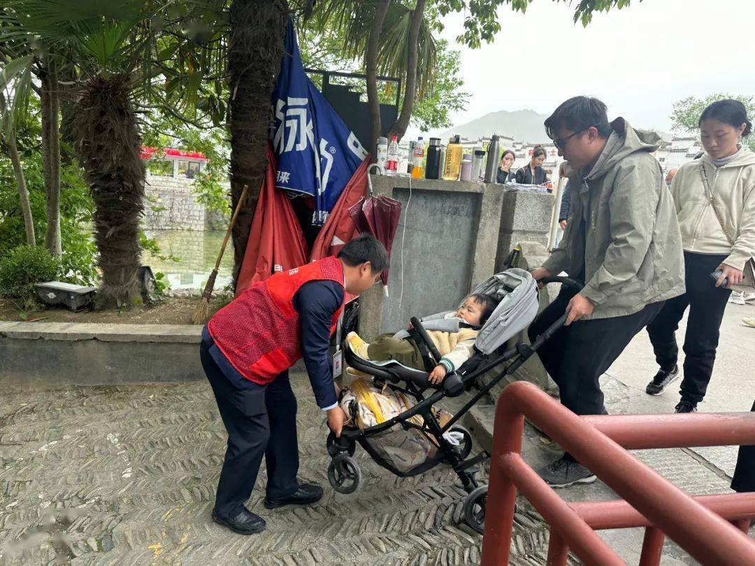 ▲黟县宏村景区志愿者帮助带娃游客安全通行