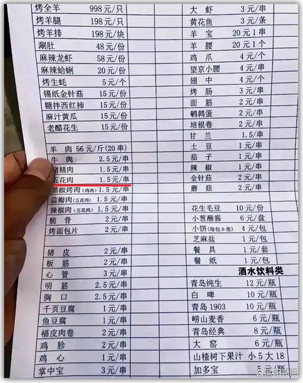 我去了山东淄博尝了一次当地的烧烤,但看了看菜单,价格似乎也不便宜啊!五花肉带皮的一串要两块钱,昨晚我们有24个人,包括3个孩子1个老人,我们自带酒水,总共花费760元,这家商家肯定挣了不少钱!