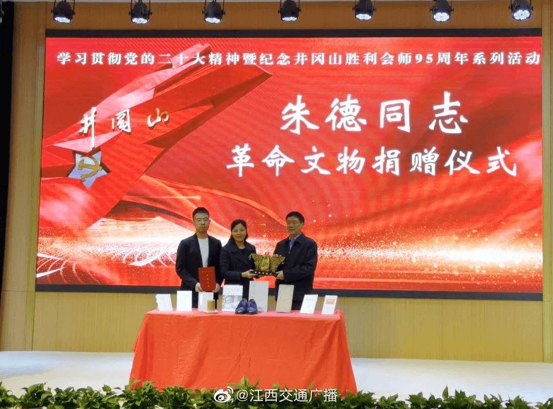 4月29日,朱德同志革命文物捐赠仪式在井冈山举行。朱德同志之孙朱和平将军、曾孙朱辰出席,共向井冈山革命博物馆捐赠革命文物10件。这些革命文物主要包括朱德同志1962年重上井冈山时穿过的皮鞋及朱德同志珍藏的书籍等,见证了他艰苦奋斗的优良作风,彰显了他终身学习、拼搏向前的奋斗精神,是党和国家的宝贵财富,是弘扬革命传统文化、传承红色基因的生动教材,填补了井冈山革命根据地创始人文物服饰收藏的空白。