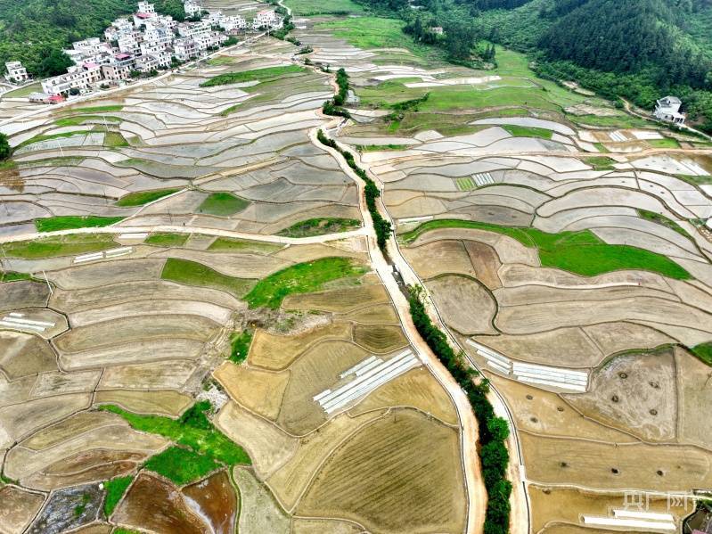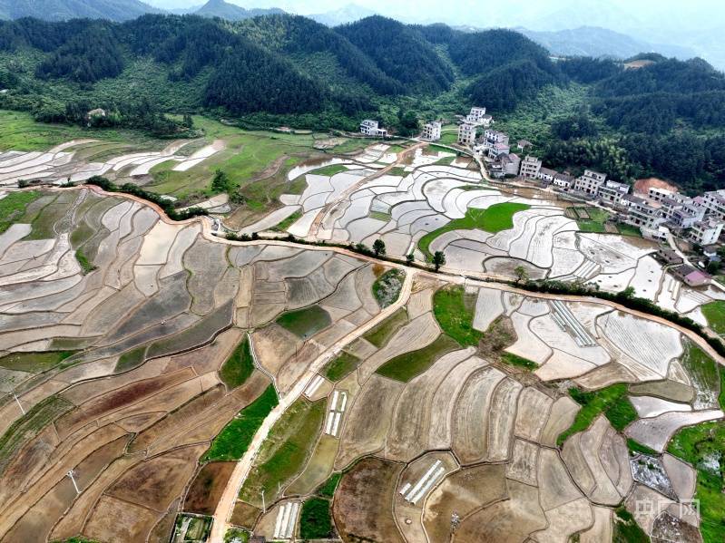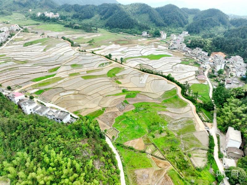 央广网吉安5月7日消息(见习记者刘培俊)田家少闲月,五月人倍忙。江西省遂川县巾石乡密岭村的稻田波光粼粼,勾勒出一道道美丽的曲线,加上山川、树木、房舍点缀其中,如同一幅美丽的水墨画,既显雄浑秀丽,又散发着浓郁的艺术情调,摄人心魂。