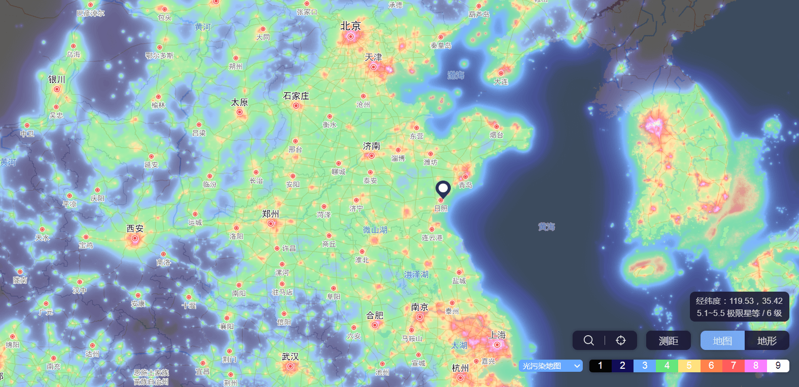 因此我们在拍摄银河时尽量选择远离城市中心、远离光污染的地方,大家可以直接在浏览器上搜“光污染地图”这几个字,看看附近的光污染情况,地图上越黑的地方光污染越弱,也越适合拍摄。