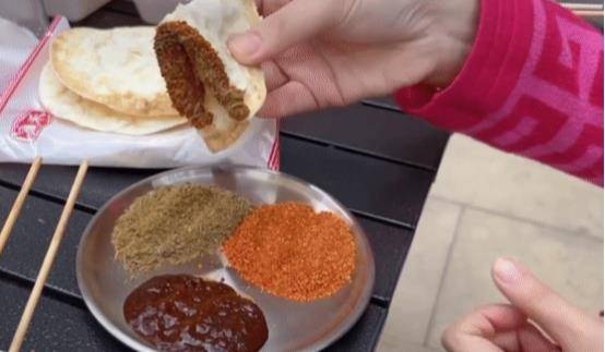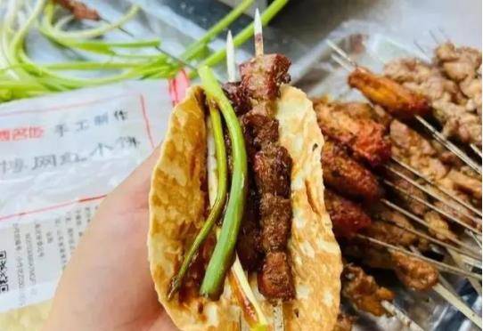 坐在炭火炉前,边烤边吃,小卷饼蘸上酱料,在搭配上特色小葱,将烤好的羊肉串放进去,每一口都是对味蕾的刺激、都是享受。果然名不虚传,他们一行人异口同声的评价道,吃的不亦乐乎!