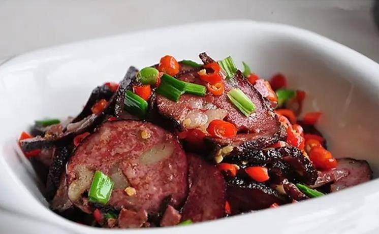 乍一听名字是不是觉得这道菜还有点奇葩,但是这道菜是真的在湖南都是非常出名的,别看外表黝黑,切片后露出的猪血和猪肉,就完全和表面黑漆漆的不同了,加入蒜苗一起爆炒,会让猪血的味道和蒜苗相互融合,蒜苗不仅去除了猪血的腥味,猪血也给蒜苗添加了动物的香味,配上辣椒,超级下饭。