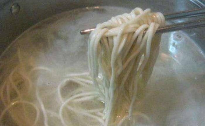 3.成形:手工拉面,至半根筷子那样的粗细程度,加一勺盐放入锅中。
