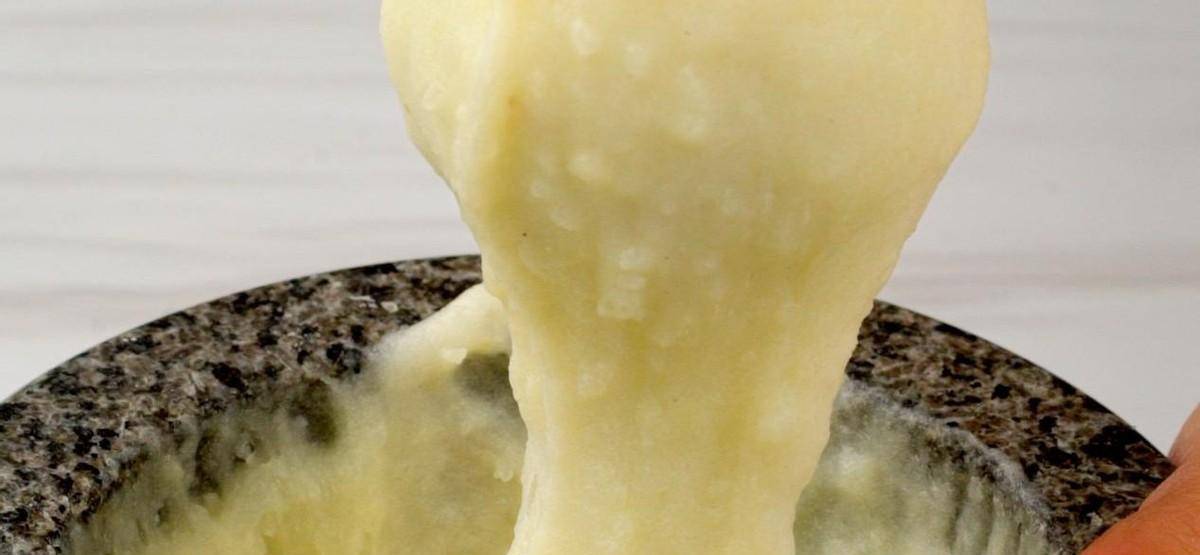将洋芋去皮切成薄片在蒸笼里蒸20分钟左右,取出晾凉,之后放入容器中捣碎,并且加入2.适量面粉(依据个人口味可加可不加),揉成光滑的面团或者用手一直捶打至筋道。