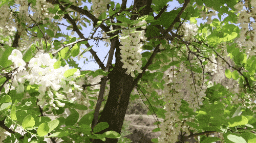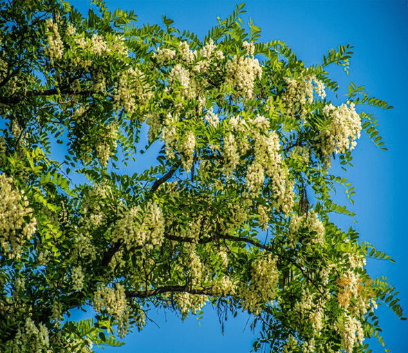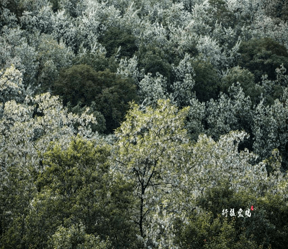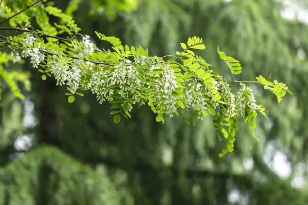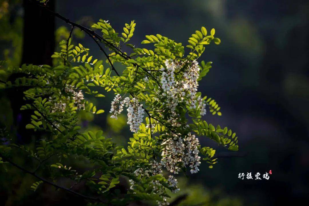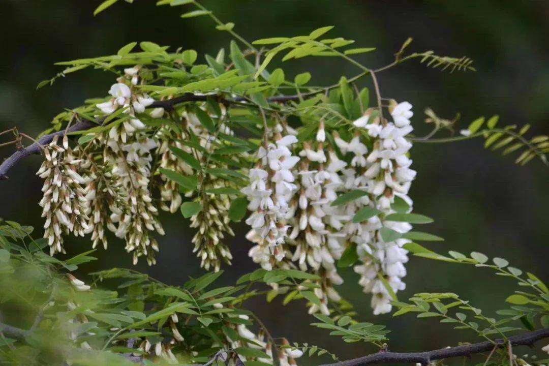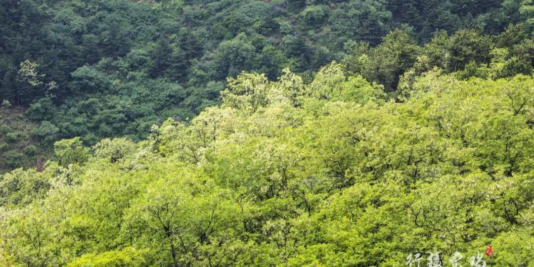 站在老槐树下驻足仰望蓝色的天,绿的的叶,白色的花与野河山的初夏相映成趣