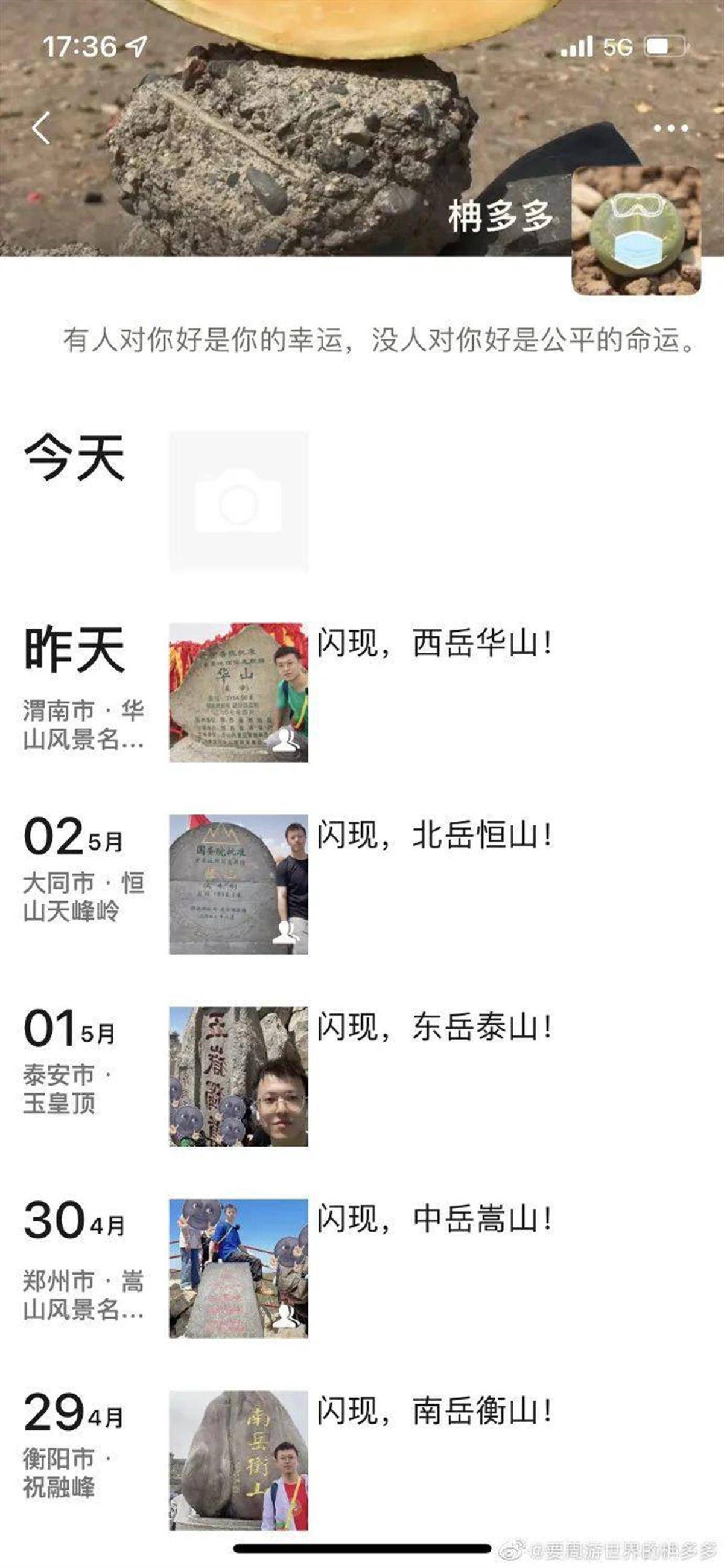 5月5日,柟多多接受采访时表示,“‘五岳’是祖国的大好河山,十年前,就爬过西岳华山。便想着五一假期一次性把‘五岳’都爬了。”