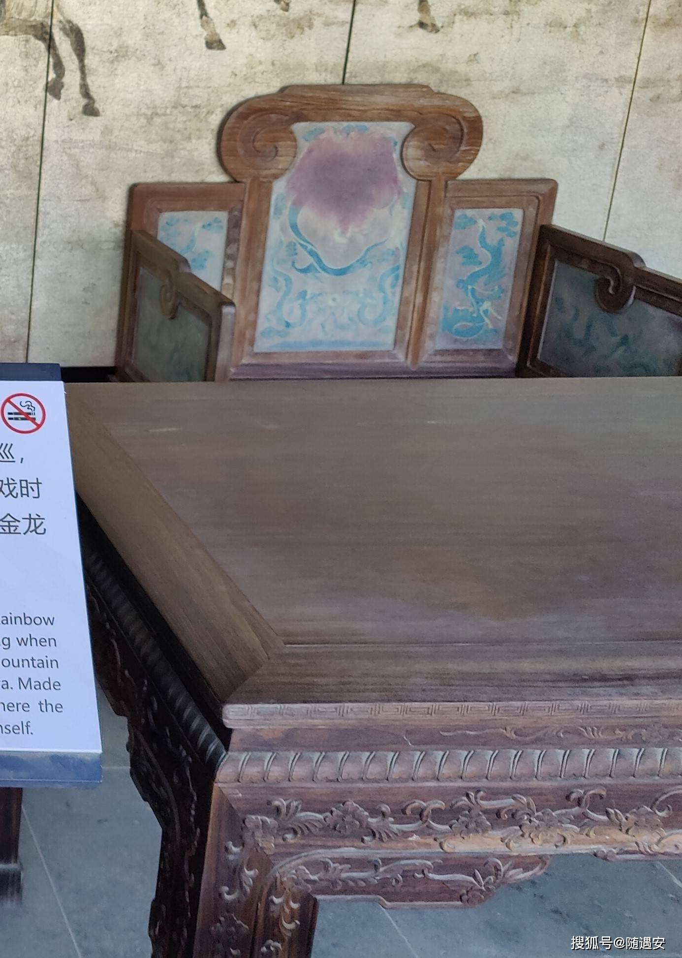 这把龙椅还颇有讲究,为虹饮山房的镇宅之宝。原为康熙皇帝南巡,驻跸岩山行宫专用。后搬到虹饮山房,供乾隆皇帝看戏时使用。采用千年紫檀木要精制而成,上刻九条金龙,金龙呈腾飞之势 ,显示出至高无上的帝王之尊。只是随着岁月的流逝,椅上所雕腾龙上的金粉掉落,呈斑驳颓败之相。