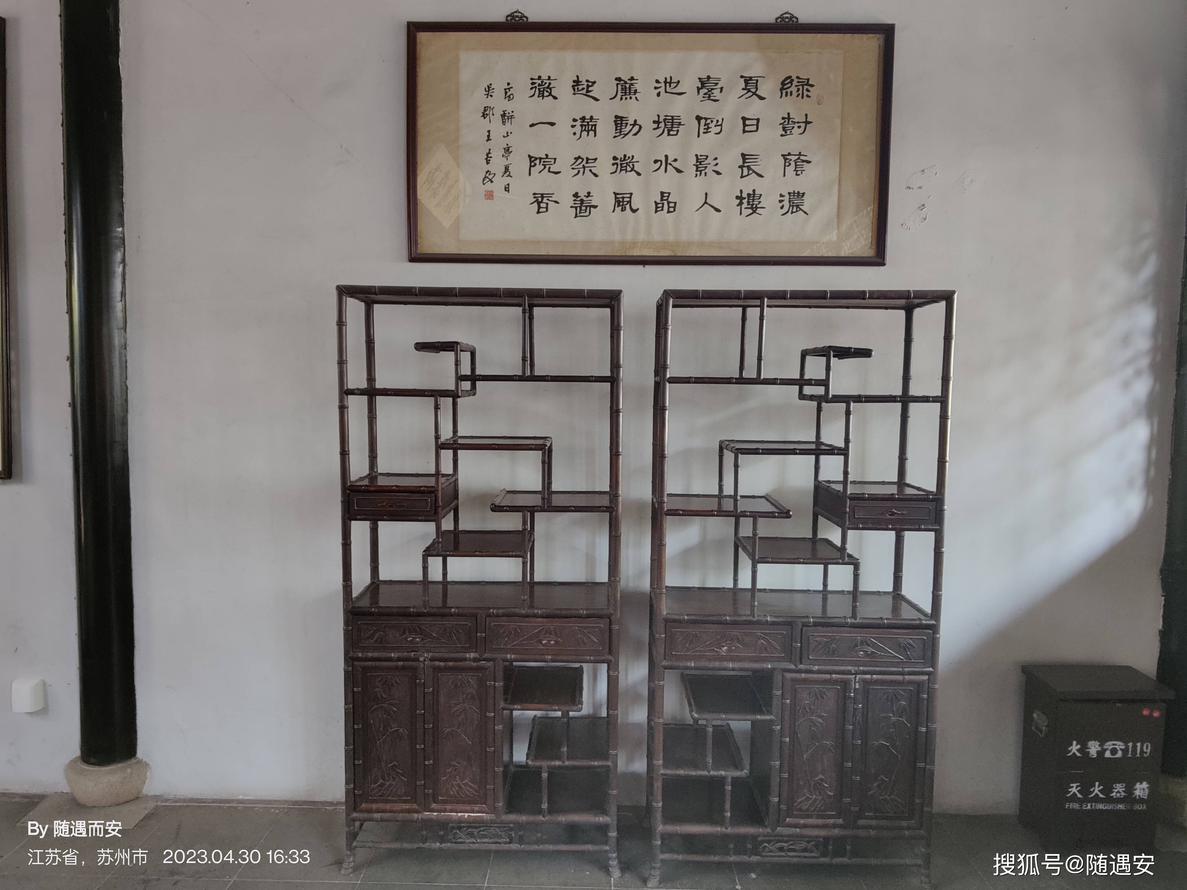 临出园时,看到山门右侧有个翠幄亭,里面立有一块大理石山水图屏。雕工细致的檀木屏架精雕细琢有八仙图案,也算是一件文物了。