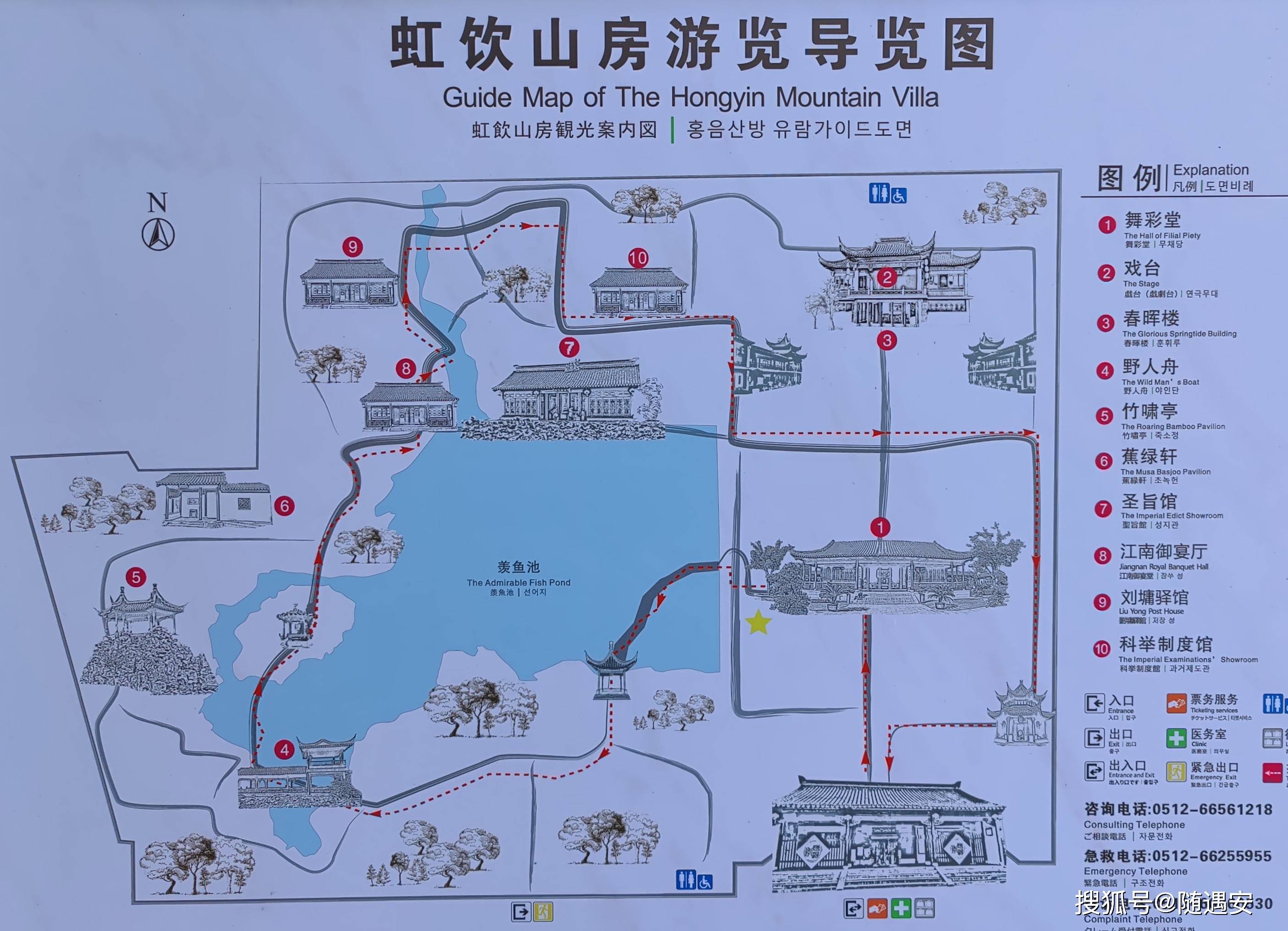虹饮山房是清初木渎文人徐士元的私家园林,乾隆下江南每游木渎,必先在此弃舟登岸,入园游历。因而,当地都习惯称虹饮山房为乾隆的民间行宫。纪晓岚、和珅、刘墉等大臣也都曾数次下榻于此,留下脍炙人口的佳话。虹饮山房由秀野园和小隐园二处明代园林联袂而成,其“溪山风月之美,池亭花木之胜”,胜过其他园林。清末,小隐园部分为一代”刺绣皇后“沈寿故居。按习惯还是先拍摄导游图,以便按图索骥,尽可能避免漏掉该一游的景点。