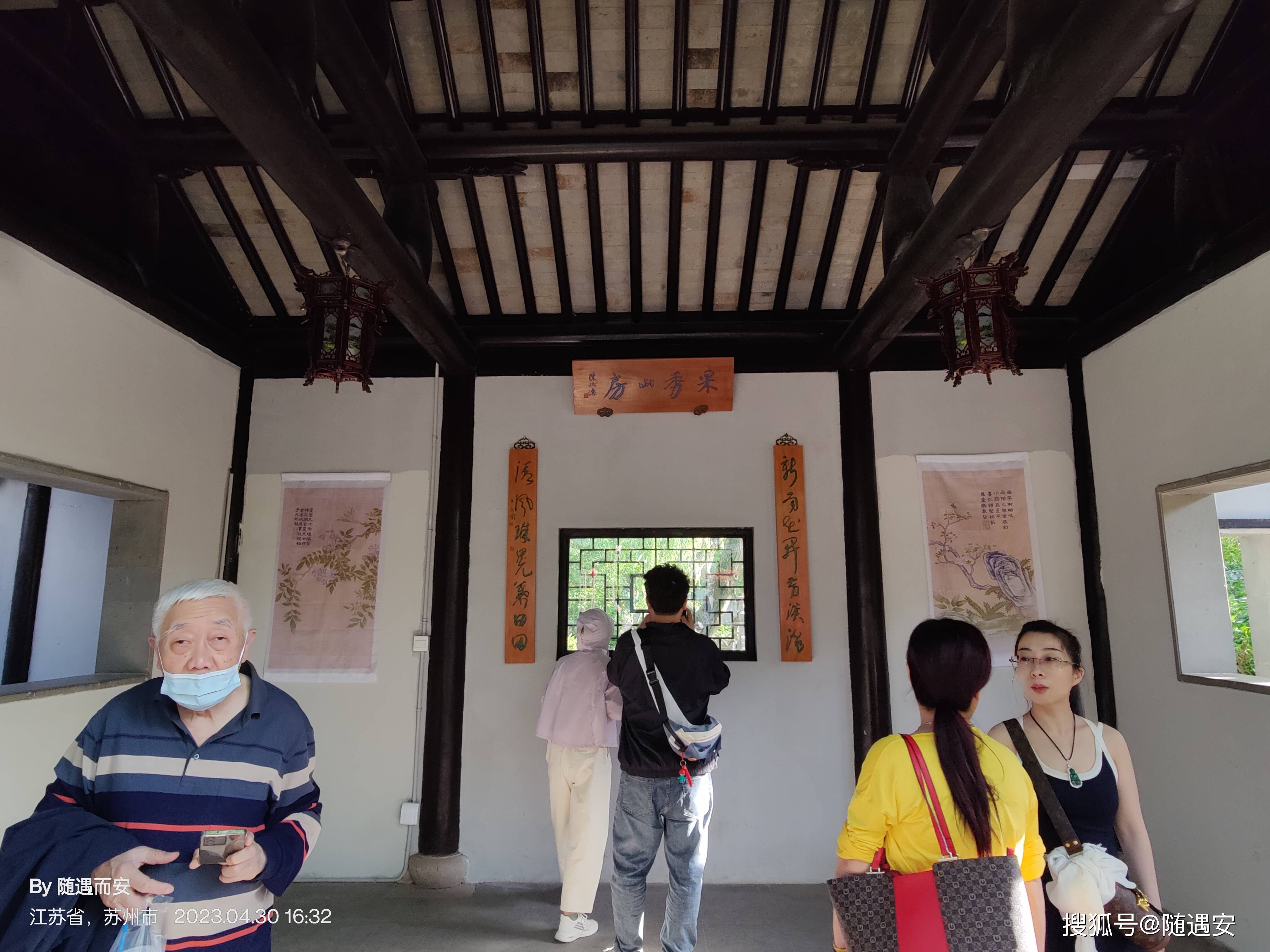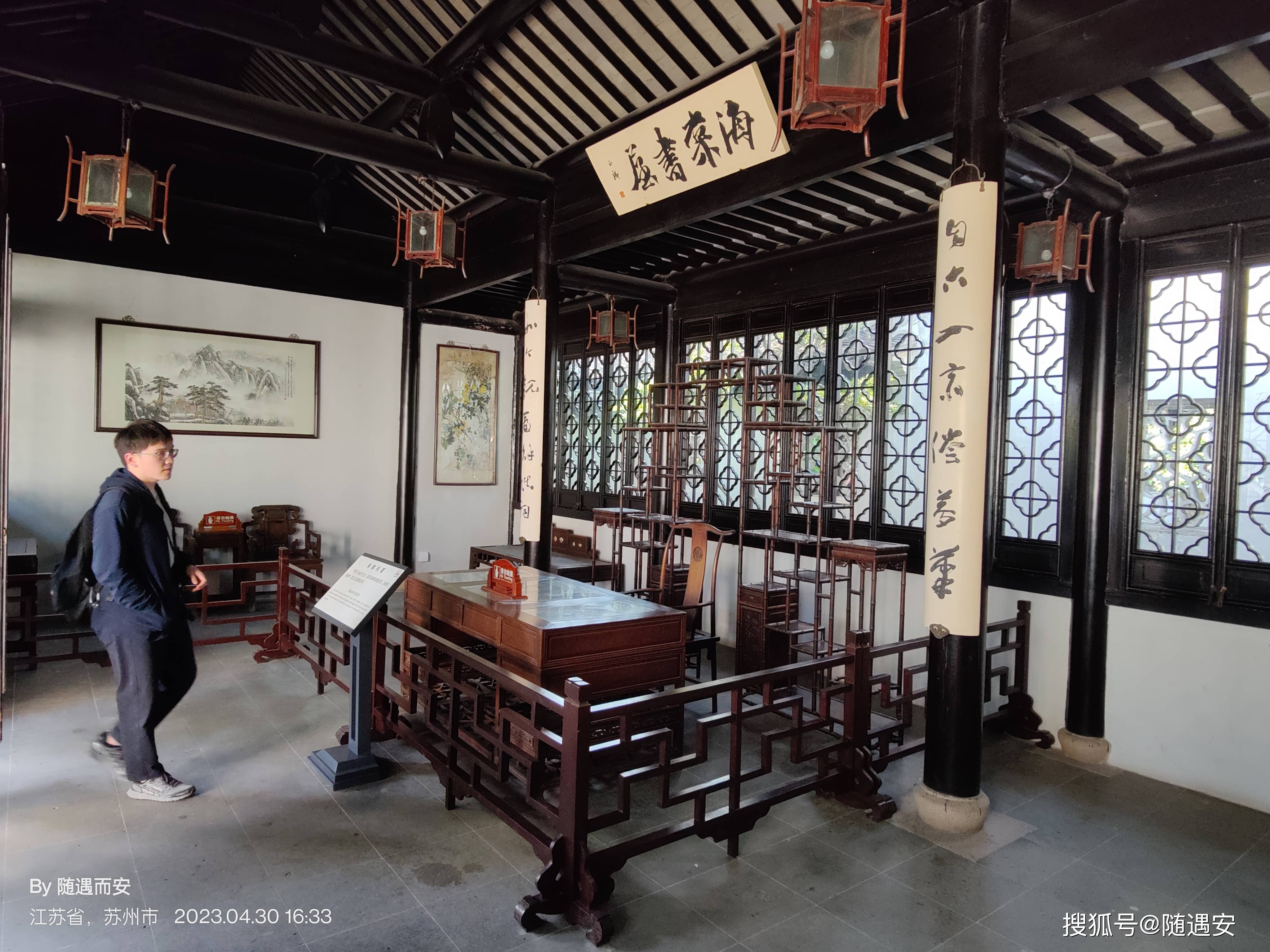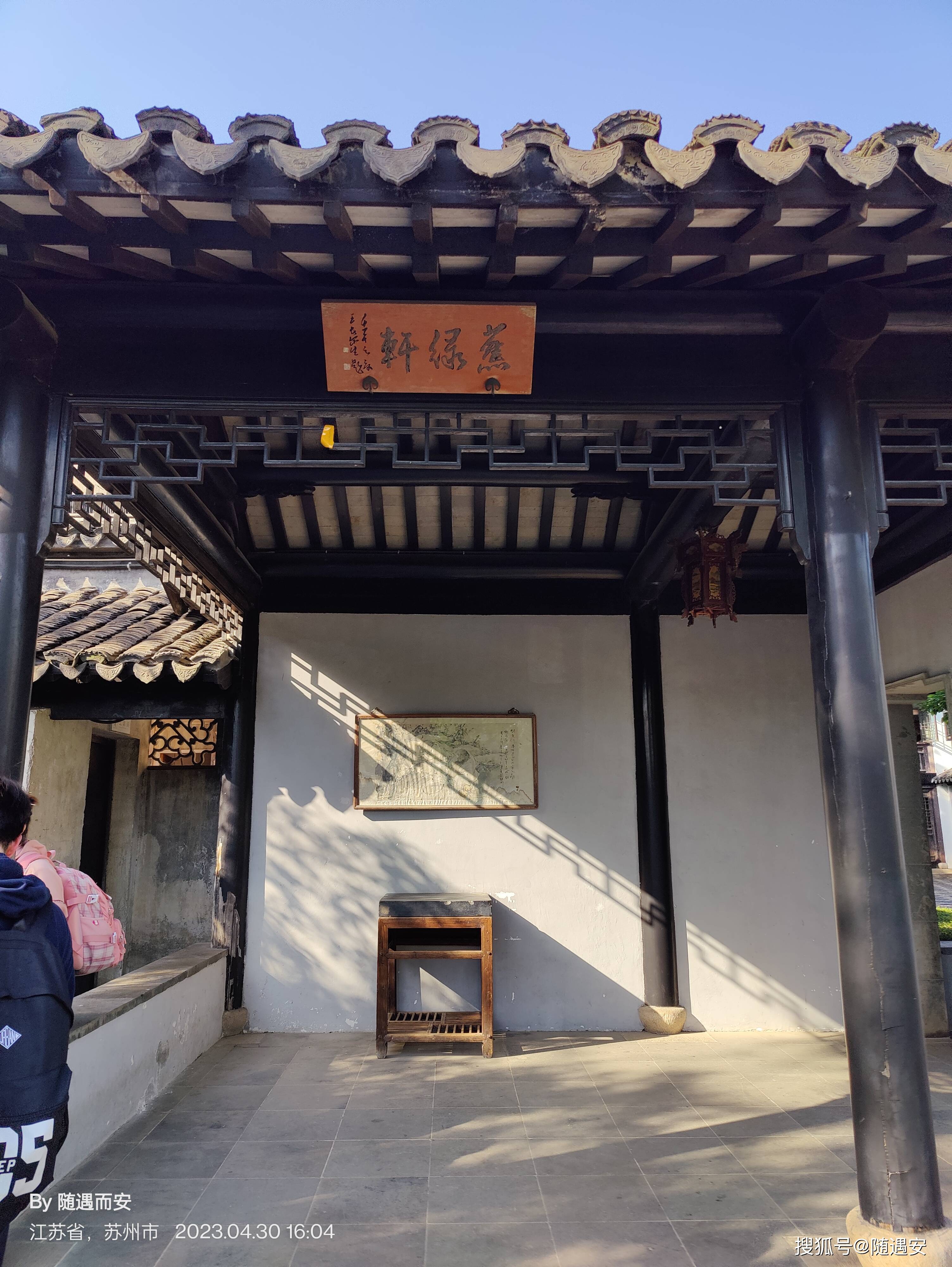 位居第三进的尚贤堂为苏州罕见的明式楠门厅,迄今已有400多年历史,木础石质,典雅古朴;楠木直柱,圆润柔和;雕刻简洁疏朗,色调淡雅素净,具有实用和 审美功能。堂内坐着的应景演员正在小憩,自然是人手一部手机在做“低头族”。