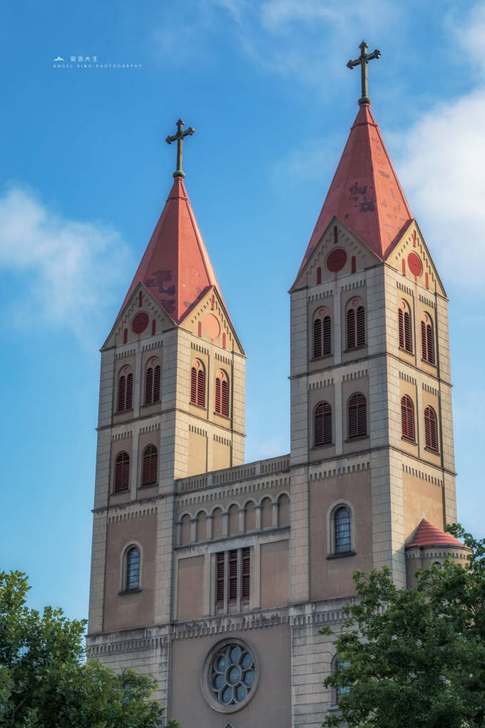 早起的空气就是好,一路穿梭在红瓦绿树的欧式建筑中,远远的就能看到两个十字架的尖顶。作为全国重点文物保护单位, 青岛 天主教圣弥 厄尔 大教堂有着较高的知名度。