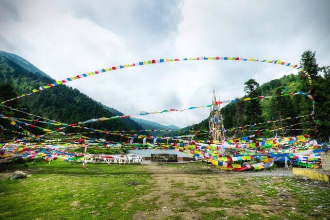 开车到达第一个景点达尔宗湖时雨还在下。既然来了就算下着雨也要去看看,从停车场出来只有一条路,顺着栈道往下走就看到达尔宗湖了。