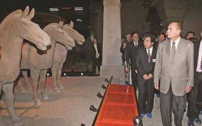 1978年,法国总统希拉克受邀参观兵马俑。要知道,希拉克也是中国文化的狂热爱好者。希拉克比李光耀幸运的一点是,希拉克参观时,兵马俑已经挖掘完毕,配备设施也已完善。所以希拉克眼中的,便是成百上千的兵马俑整整齐齐的排列着,可想而知,那是多么震撼的一个画面。同样的,希拉克也说出了兵马俑最好的宣传语—“世界第八大奇迹”。
