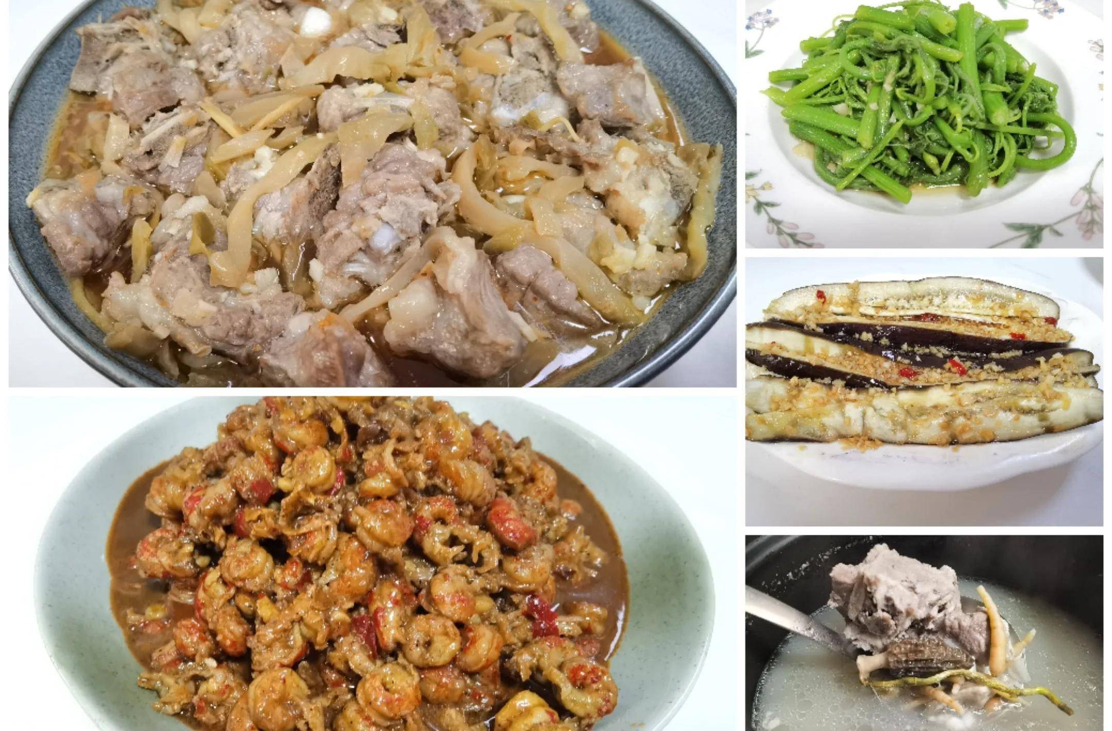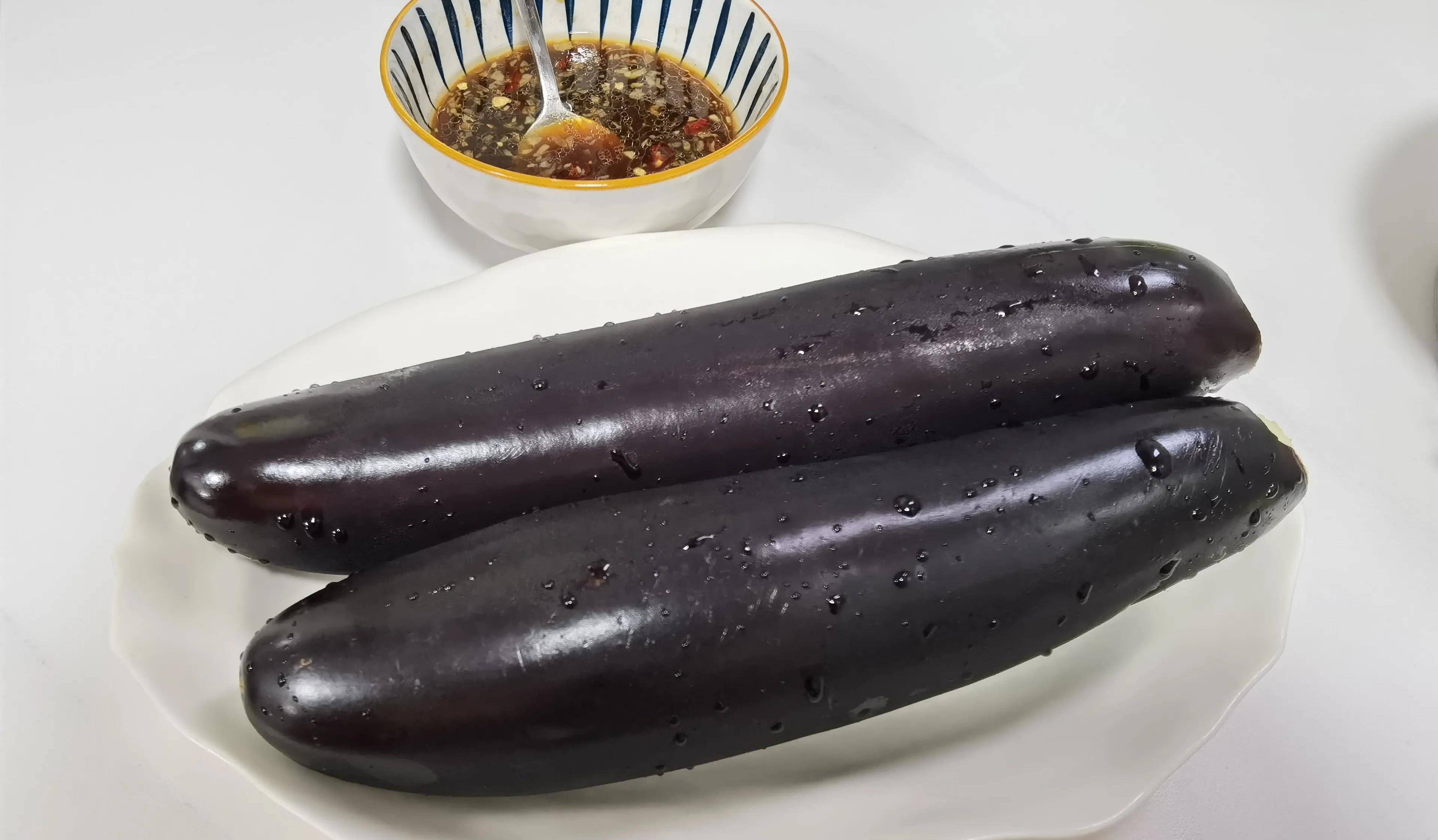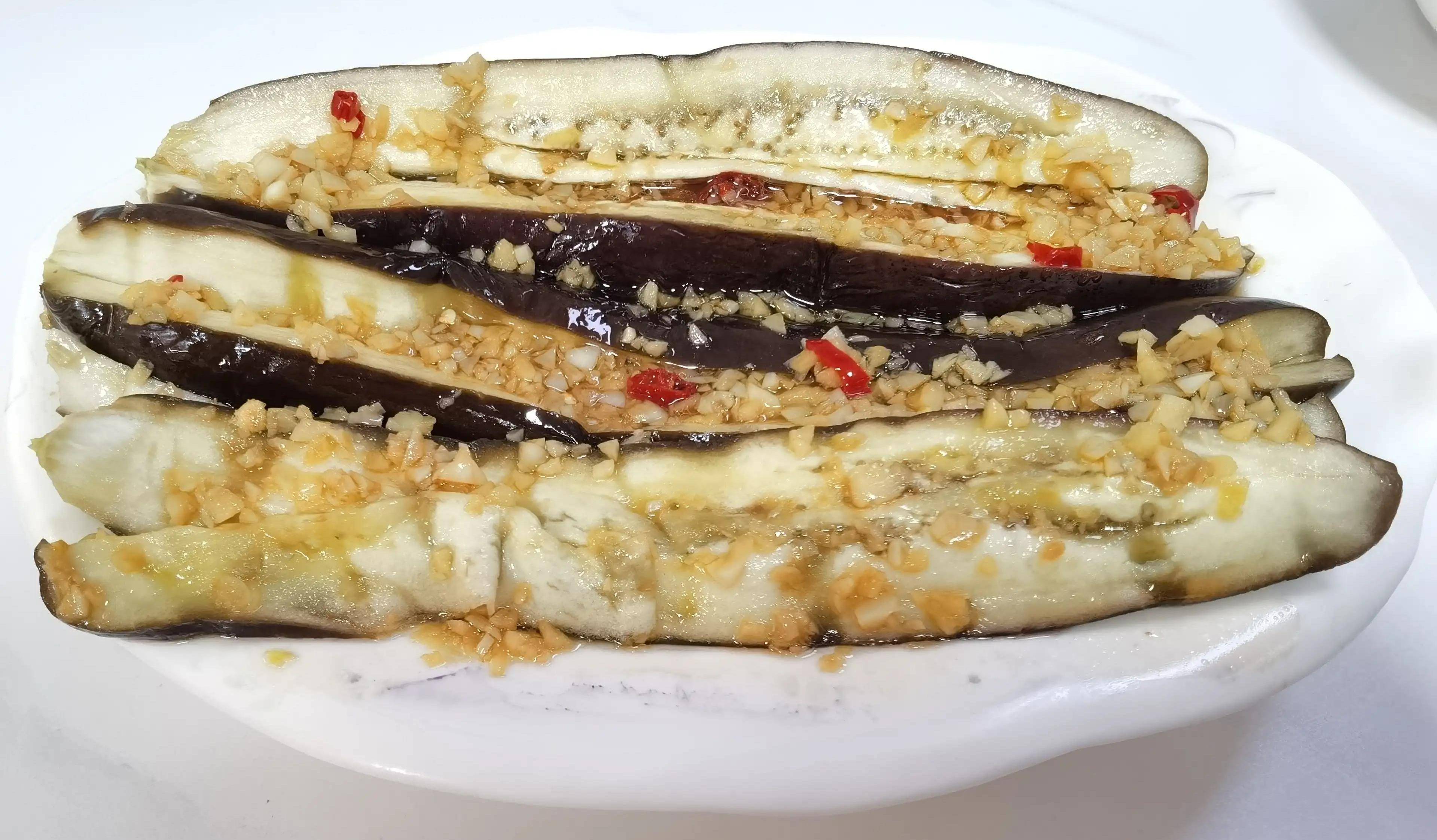 清蒸茄子:茄子两个,秘制蒜蓉酱料。茄子上汽蒸12分钟,出炉,淋上酱汁即可。