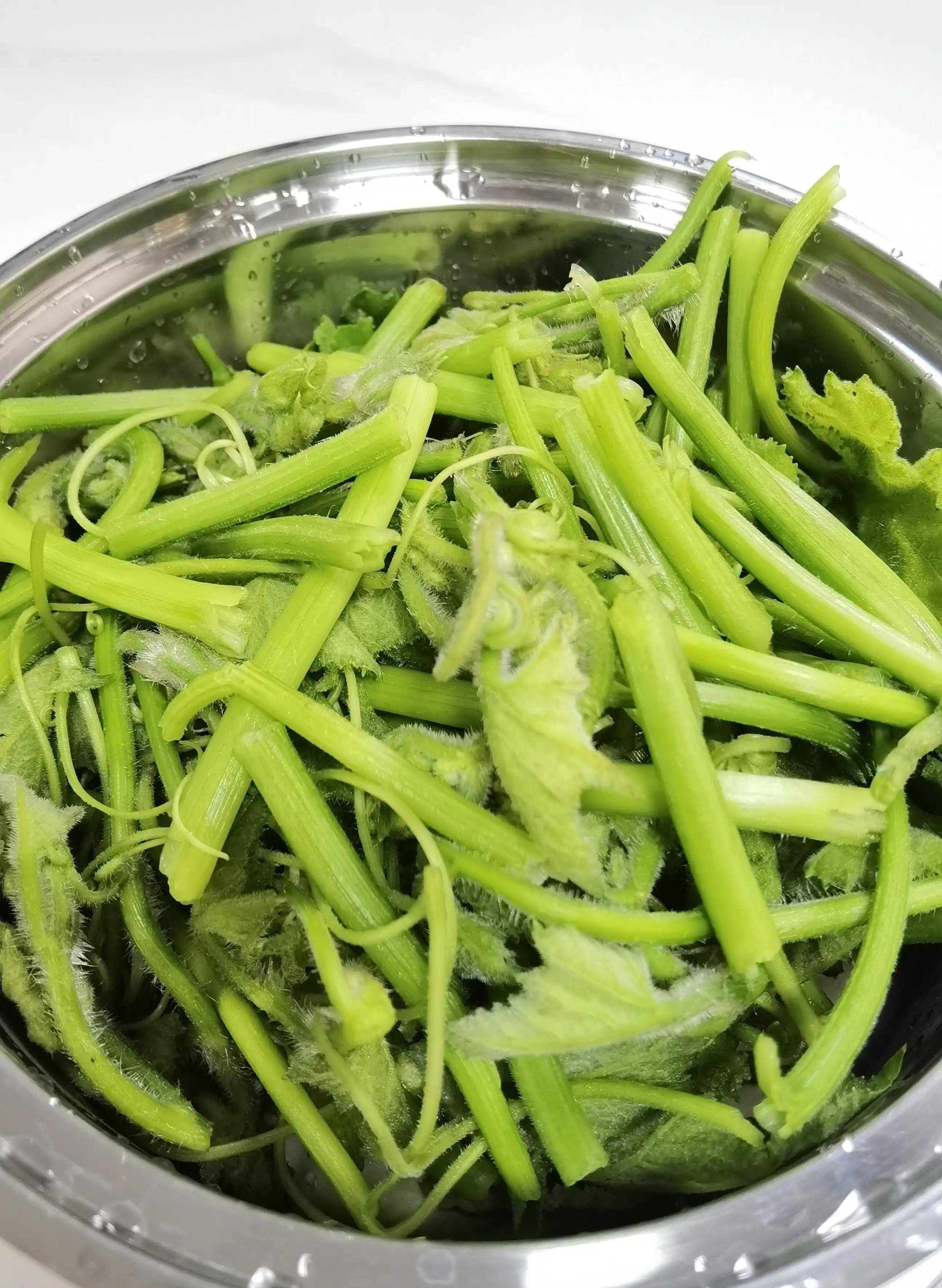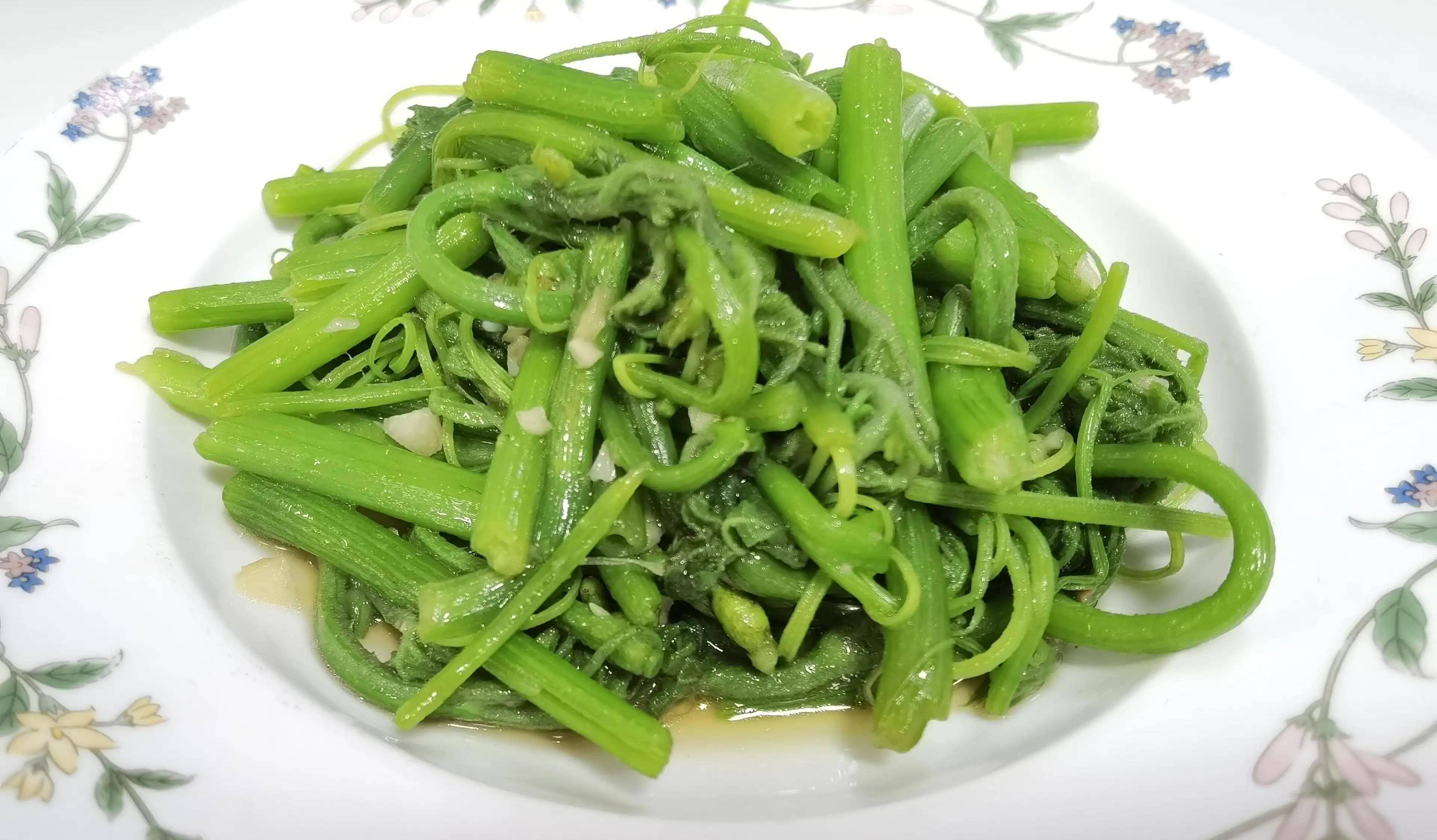 蒜蓉炒南瓜苗:南瓜苗,蒜粒。下油爆香蒜粒,放南瓜苗炒几分钟即可。