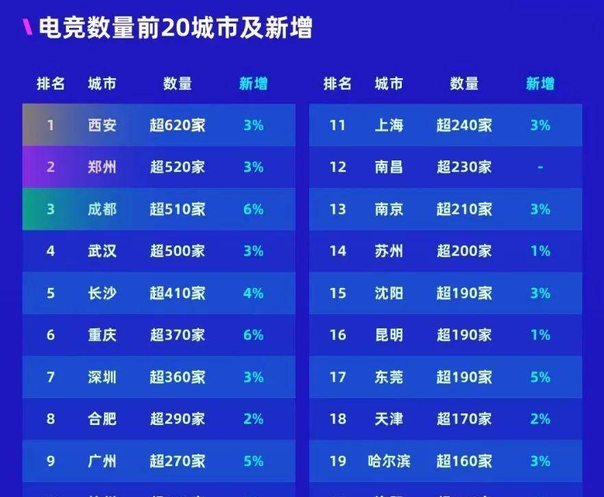 目前,西安以超过620家的数量,稳居城市电竞酒店数量TOP1,前五的其他城市分别为郑州(超520家)、成都(超510家)、武汉(超500家)、长沙(超410家)。