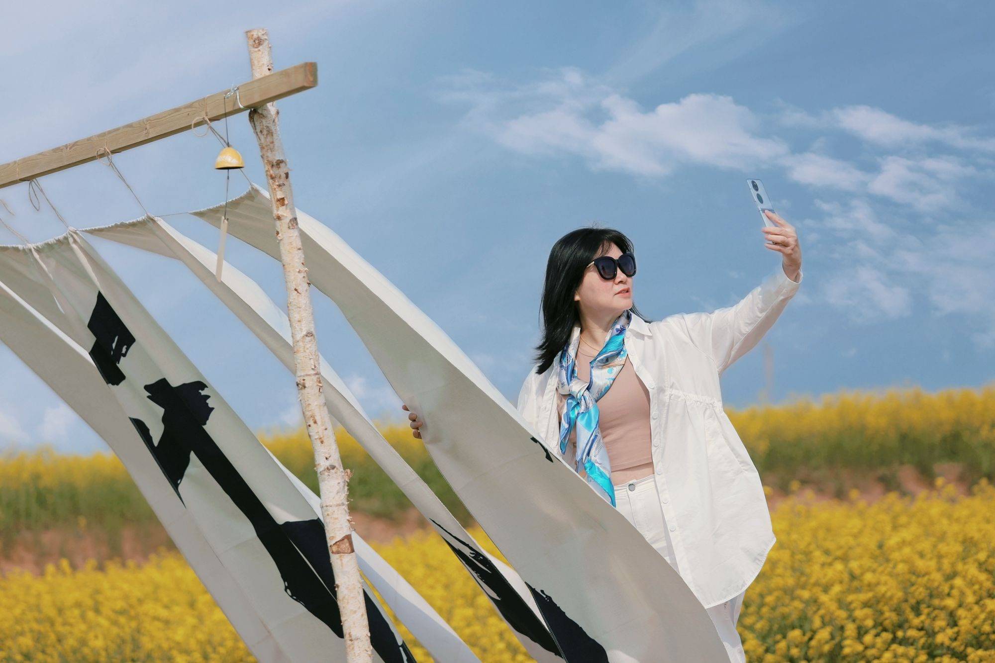 络绎不绝的人群为赏花而来,行走在花间田垄中,或驻足细观,或追逐奔跑,或拍照打卡,笑语欢声荡漾在花田之中。不经意间与古装小姐姐走个擦肩,古风古韵,让人恍惚,不知今夕何夕,不知此地何地。