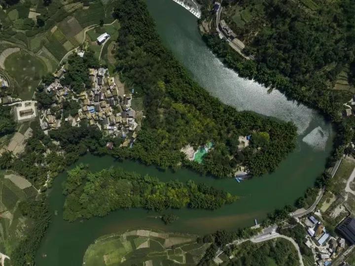 如若不然,可择一处制高点纵览全景,一座漂亮的小岛被蓝绿色河流包围、岛上竹林茂密,几棵高大的古榕点缀其中,竹林与榕树间,时而炊烟袅袅,时而畜叫鸟鸣,俨然进入了世外桃源。