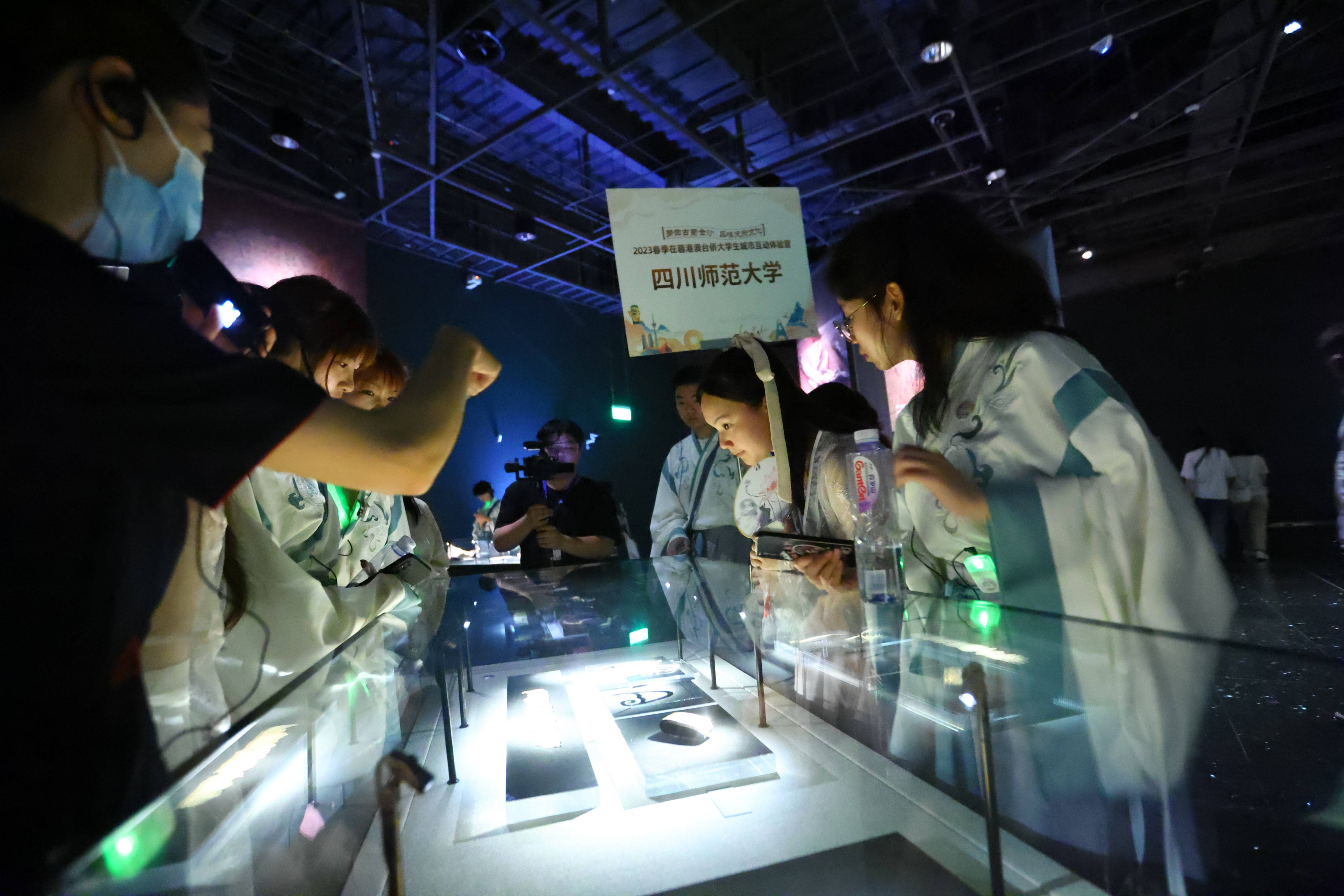 为了让大学生们沉浸式体验中华优秀传统文化,本次活动特别安排了“国风剧本杀”活动,将传统文化中的“礼、乐、射、御、书、数”形成体验项目。大学生们身着汉服,穿梭在古蜀、秦、汉、唐、宋、明等不同的时代,在成都金沙遗址博物馆体验了一场“穿越之旅”。