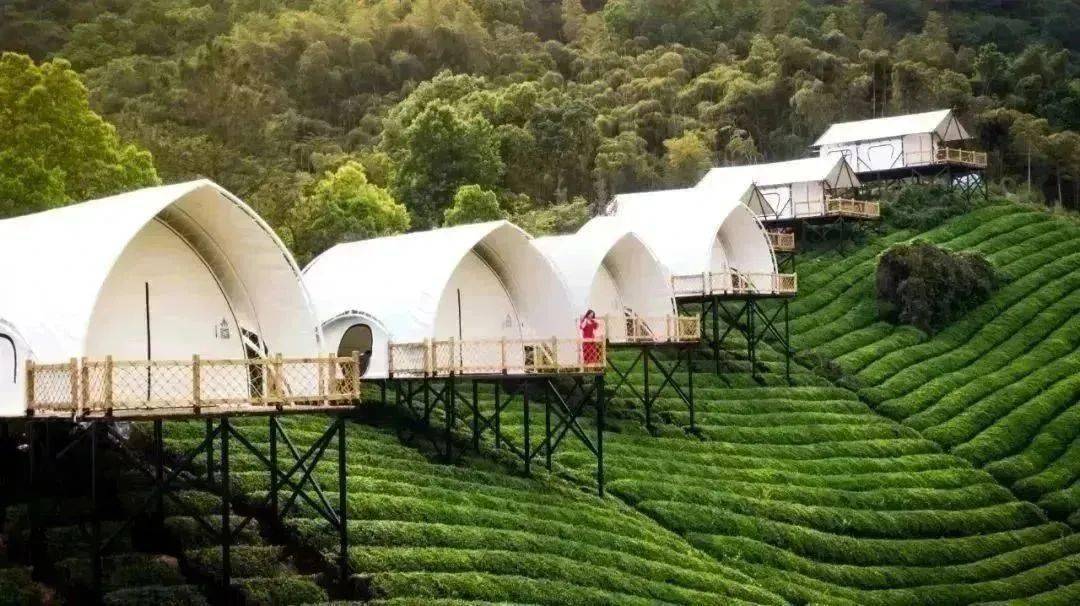 位于上渚山奇幻谷内的茶野里野奢帐篷露营地以全境森林为背景,漫山杜鹃谷为邻面朝一整片原生态茶园,坐拥全景绿境。这里有着归园田居的隐世浪漫,也有着现代化的舒适设施,想象中的山野烟火气,都能在此找到。