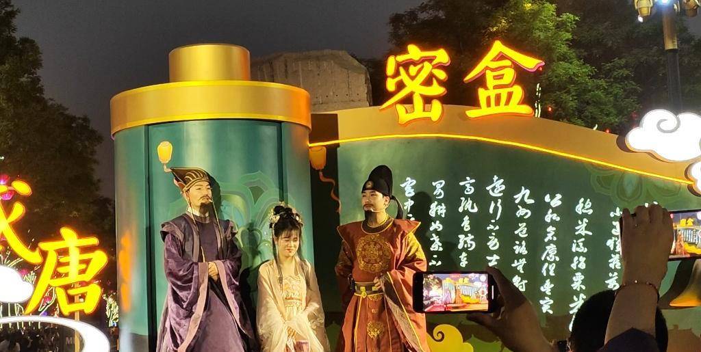 盛唐密盒是景区策划的表演活动,由工作人员扮演“房玄龄”、“杜如晦”两位大人,凭借“房谋杜断”的历史人物组合,加上两位演员的默契配合,谈吐风趣,尤其是与游客的互动,自然而有趣。更是让“来、照相”等有趣“爆梗”,迅速在网络上走红。