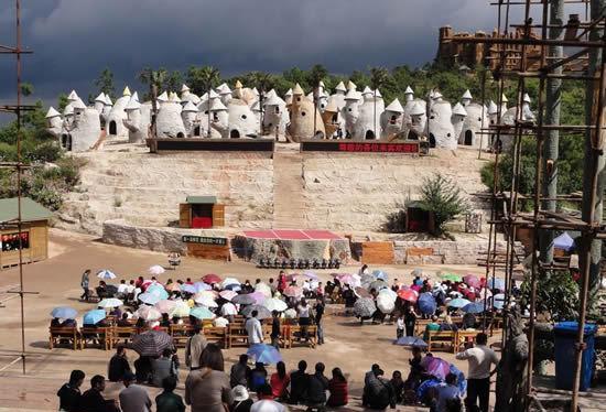 如果抬头往上面一看,还会看到山的远处有一座类似童话世界中城堡一样的建筑,这里就是小矮人们居住的“王国”,这样的场景让人们还没进入其中就似乎已经感到了浓浓的童话气息和氛围,据说,在这个“小矮人王国”中生活了来自全国各地多达100多位的袖珍人,有男的有女的,而且年纪各有不同,最小的年纪只有18岁,而最大的已经50多岁了,他们在其中主要扮演的就是演员的角色,每天的任务就是吸引游客们的到来。