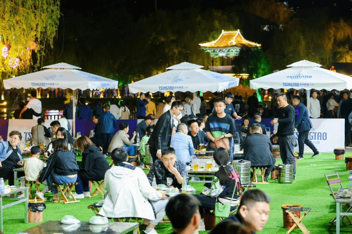 在河北省石家庄市栾城区古栾水镇,游客正在啤酒花园享受美食。 栾城区委宣传部供图