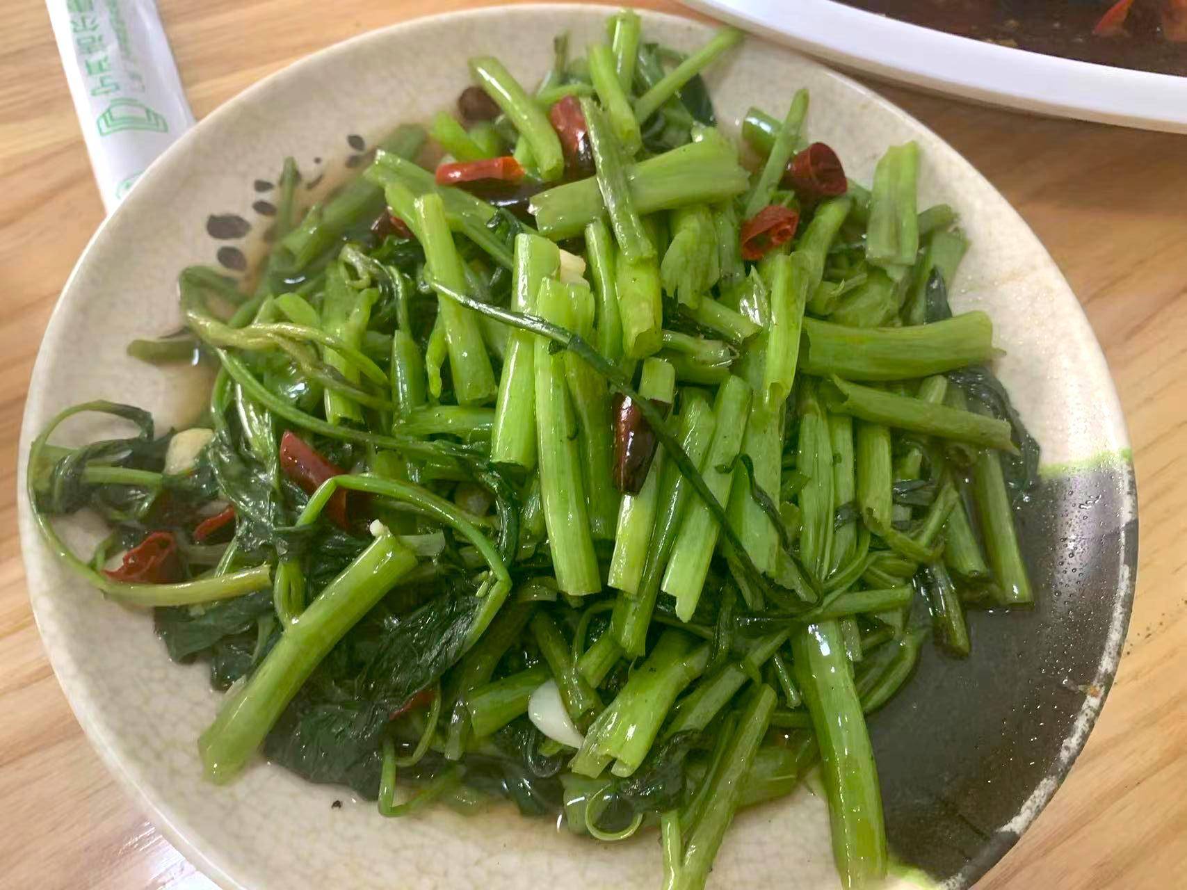 空心菜是当下比较火的一个菜了,炒的时候也简单,放入油,来点辣椒,接着放入空心菜直接翻炒就行,炒软之后直接上桌,味道还是可以的,这个菜看着品相是差了点,但也没有其它的大问题。
