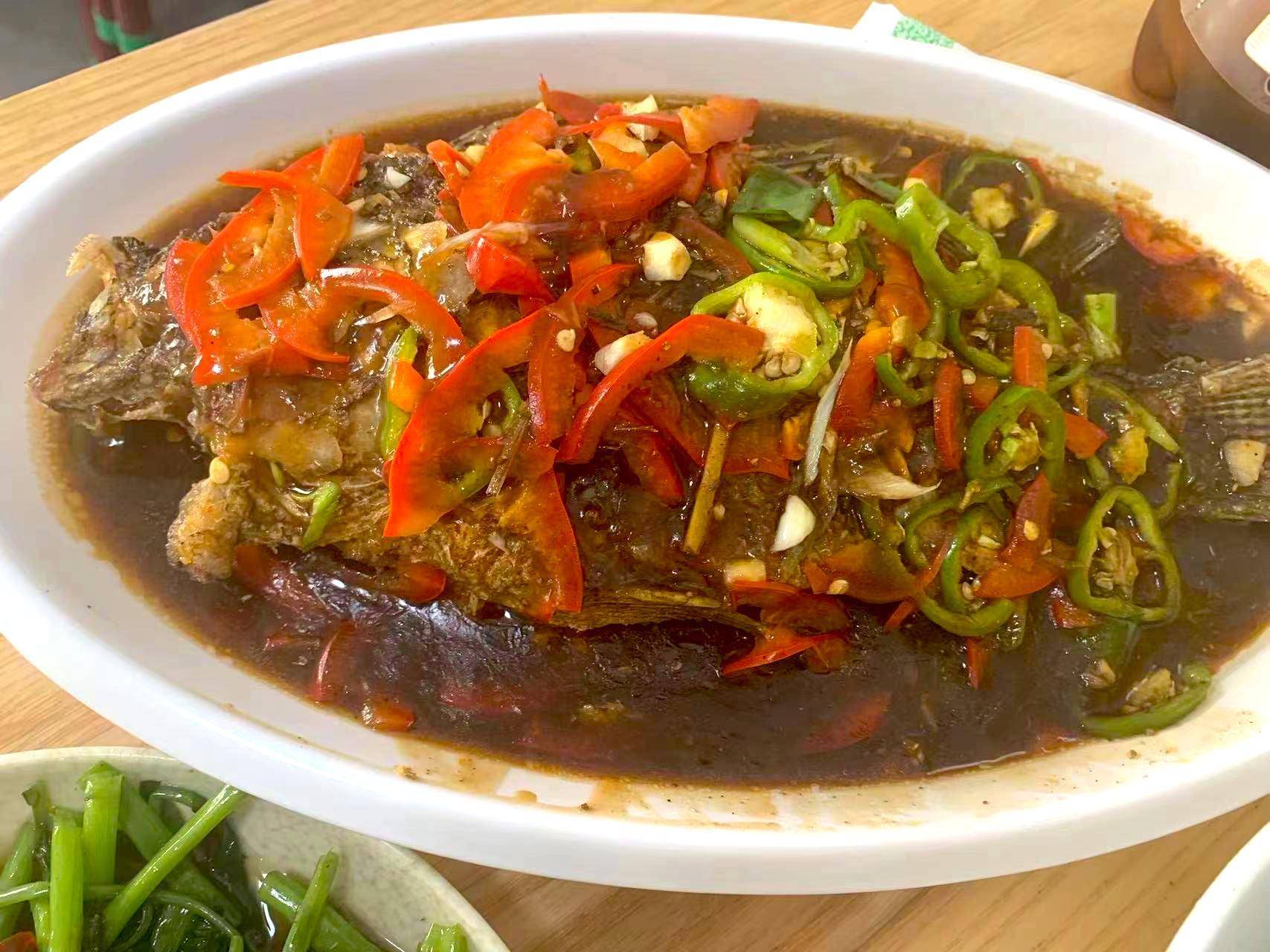 鱼用的是当地的罗非鱼,制作的时候,把鱼煎好,然后炒料,在炒料的时候,放入了番茄,吴军知道晓芸,喜欢吃酸辣的菜,于是特意安排了这样一道菜,这个也算是当地的一个特色菜肴了。