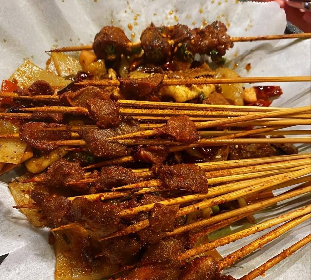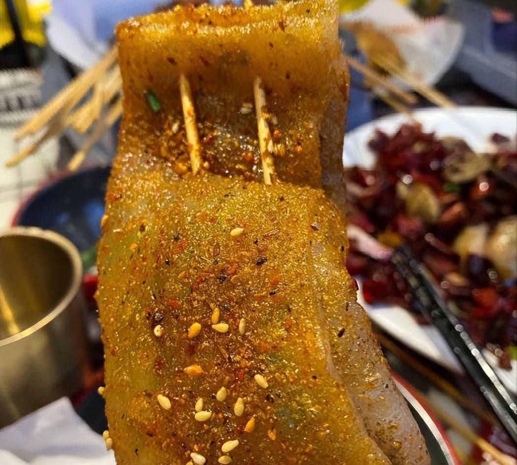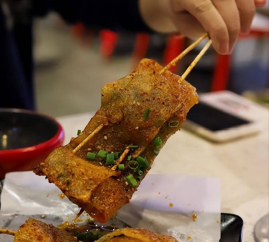 接下来的苕皮和豆干让他们惊艳,里面裹了洋葱酸萝卜等等,火候掌握得很好,烤得很酥香,吃起来爽而嫩,一口下去直接爆汁,融合了软糯和鲜辣于一体,热乎乎的出起来特别过瘾,而且价格也不算很贵,都是八元一串。