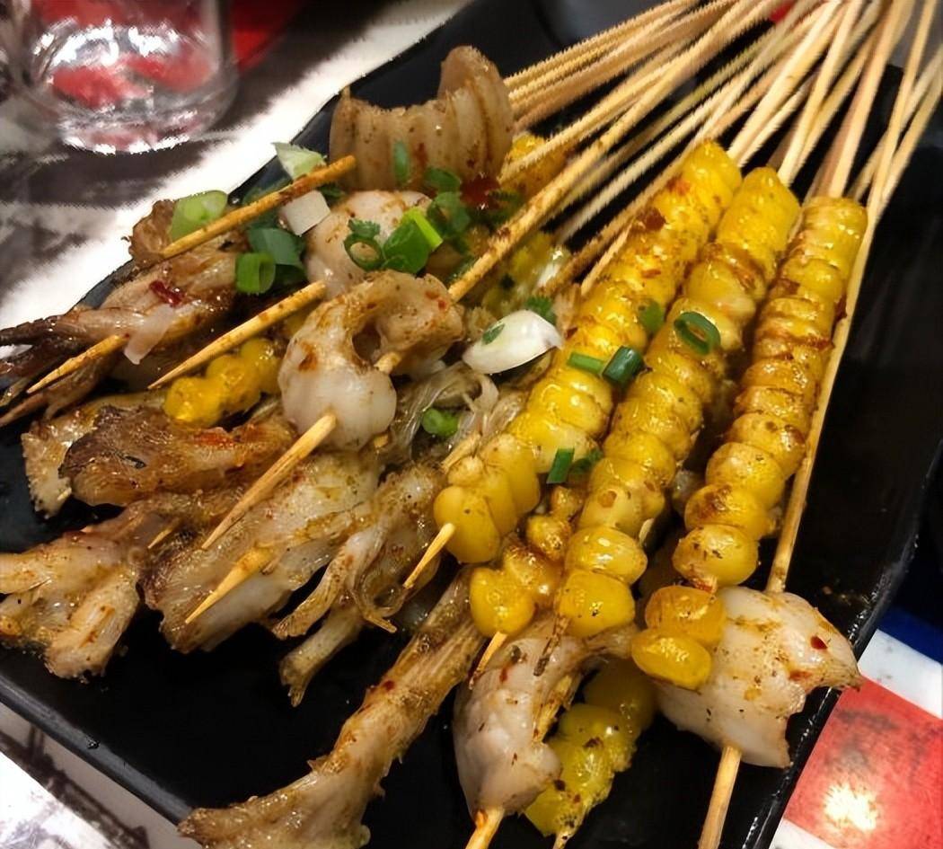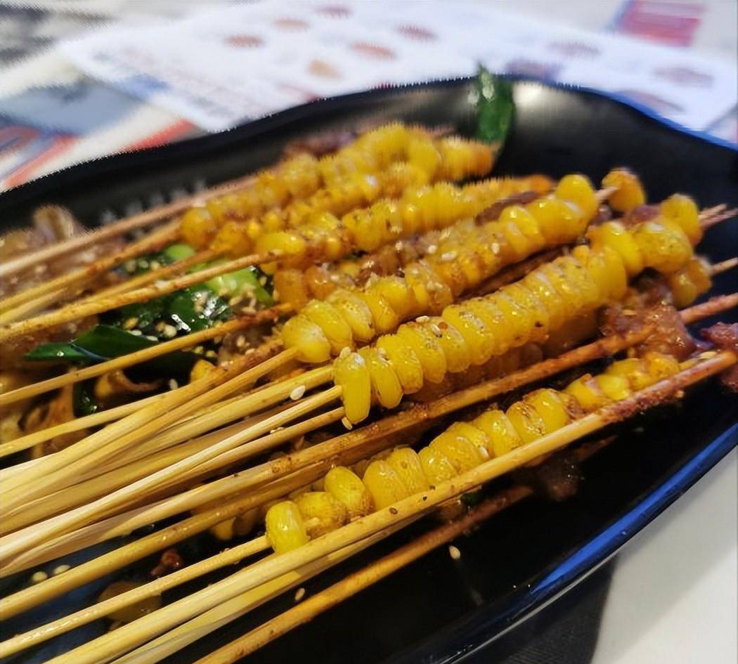 这家店店面很宽敞,装修得比较复古,店内收拾得很干净,服务员也很热情,菜品就摆在桌子上,明码实价看得到吃得更放心。但是价格比起山东要贵一点,比如玉米是一颗颗串起来烤的,这六个人从来没有吃过这样的玉米粒,感觉很神奇。