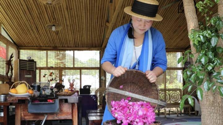 娇艳玫瑰撞上江南古朴建筑,让人心情舒畅。走进“花墨堂”,映入眼帘的是小桥流水、绿植掩映的园林景致,院中石桌上放着古朴的茶具,周边是一片繁茂的蔬果花植。“每年春夏之交和深秋时节,这里是一片粉色的花海。除了可感受花香、花语以及花文化内涵,更可在花丛中了解大自然,爱上生活。”“花墨堂”主人梓墨告诉记者。