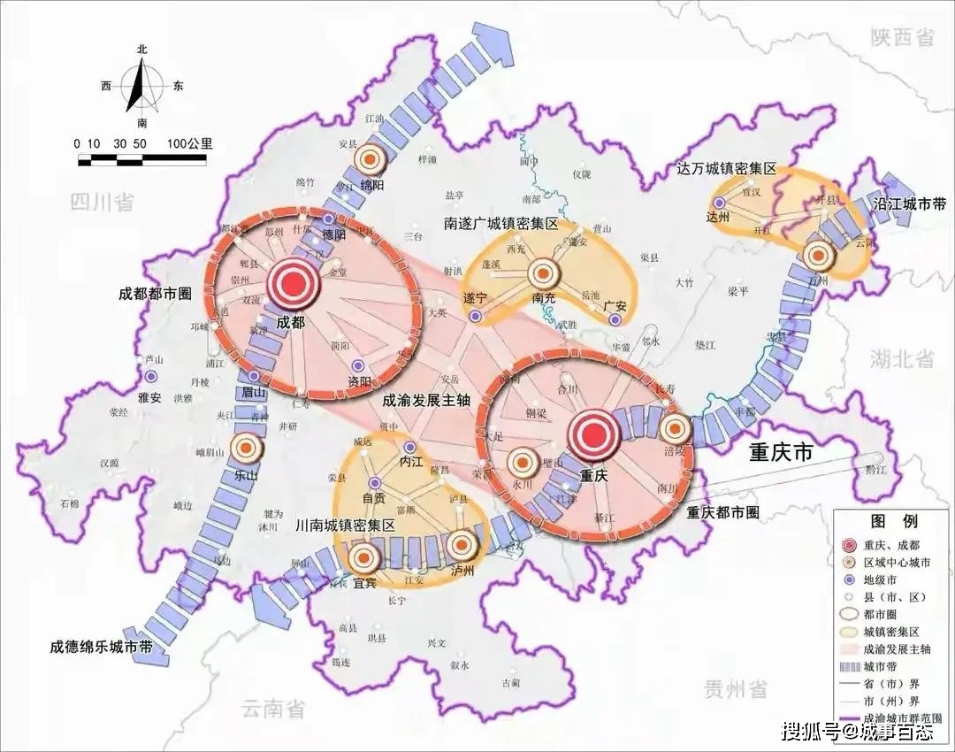成渝两个国家中心城市,一人一个圈,两个圈就像自行车的链条牙盘,不过不是变速的,因为两个城市体量和国家定位都一样,所以两个圈大小差不多。
