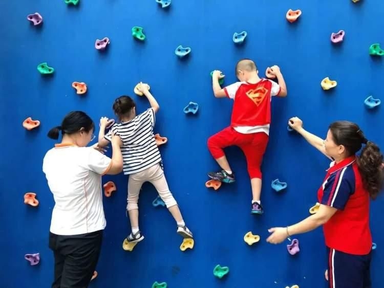亲子攀岩馆设有约4米高的岩壁,上面布设了许多大小不一的岩石点,可供儿童青少年完成攀岩挑战,同时布设了攀爬网和海洋球,以满足不同年龄段儿童的运动需求。
