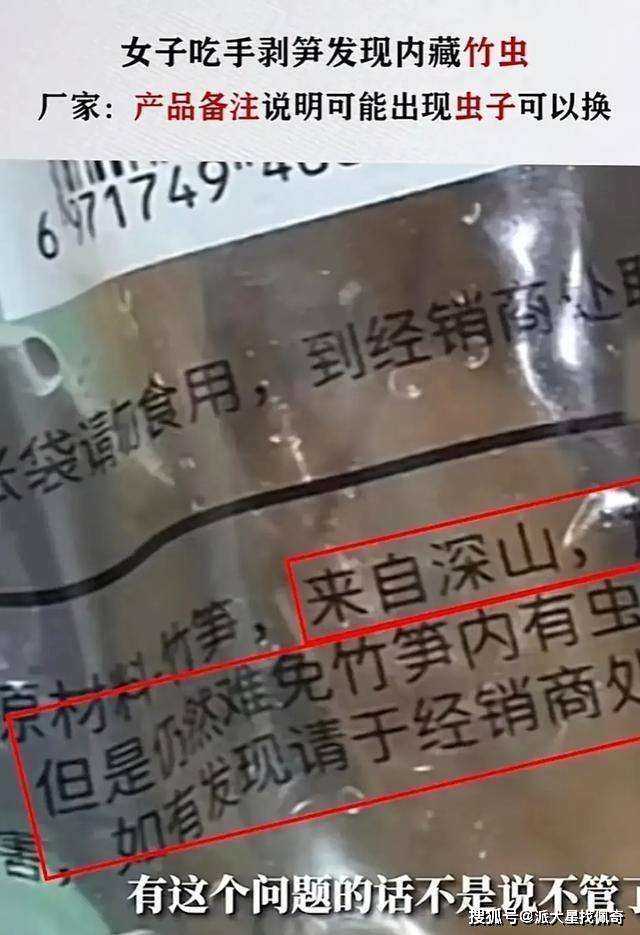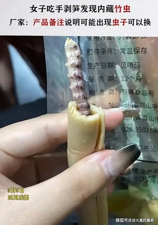 近日,四川成都的一位女子在吃手剥笋时,惊见里面有一条活着的竹虫,立即将其丢弃。她联系了厂家,却被告知这是正常现象,因为手剥笋是野生的,产品备注说明了可能会出现虫子,可以联系商家更换。这一回应引发了网友的热议,有人认为厂家太不负责任,有人认为竹虫是无害的,甚至有人认为竹虫是蛋白质的补充 。