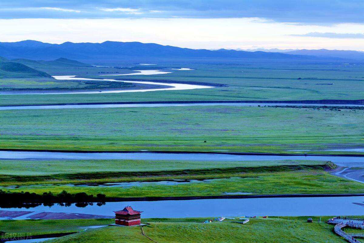 甘川交界处,流淌在草原上的黄河。被当地人叫做“玛曲”,蜿蜒环绕在原野,以一百八十度的优雅风姿形成了“天下黄河第一湾”。 亘古不变的态势静静的躺在天地之间,坐在草原高处看着黄河落日,静静融入这水彩画般的湿地。
