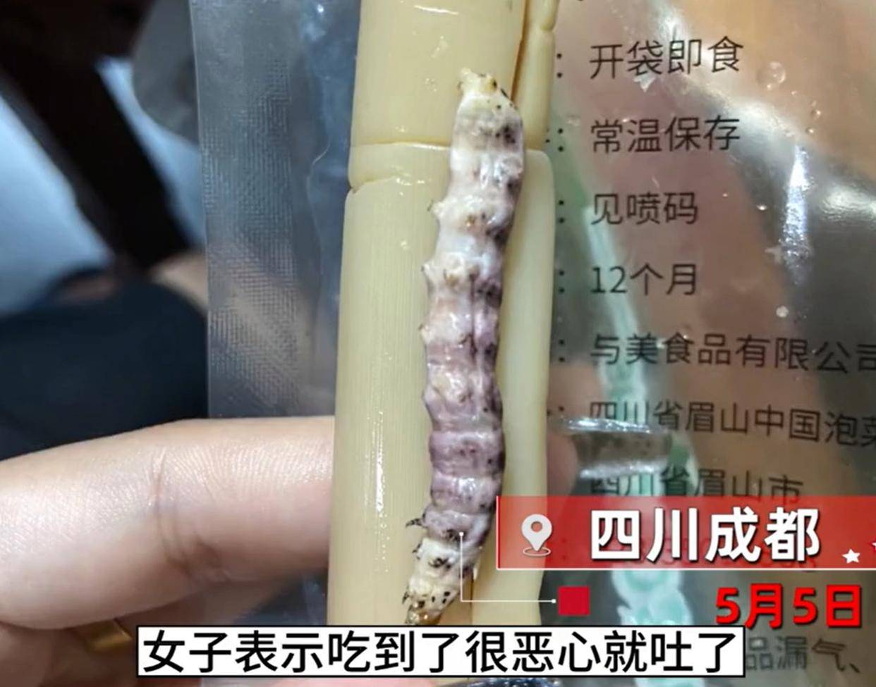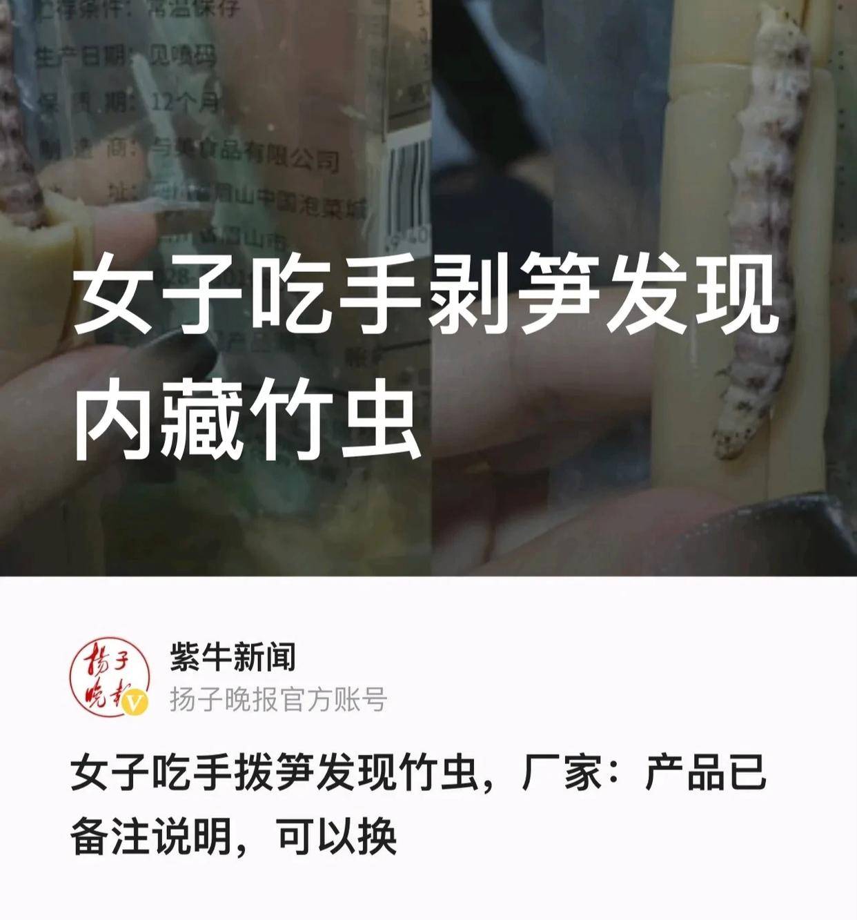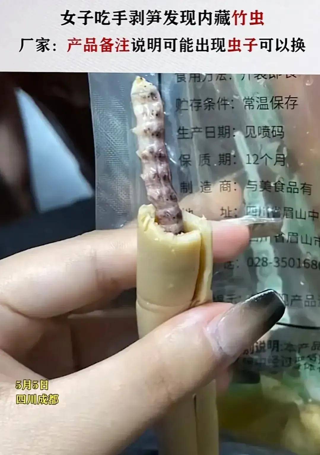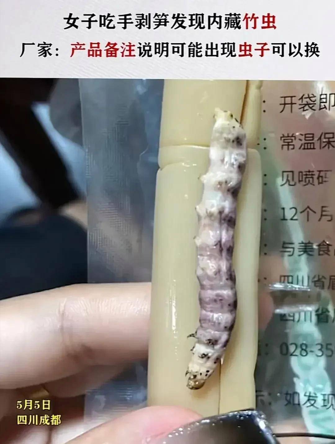成都一位女子买了一包手剥笋,吃掉一截后,发现竹笋内赫然竖立着一只硕大的虫子,原来这种虫子是竹虫。这位女子立即与生产商进行了联系,生产商表示他们已经在包装袋上明确标注了竹虫存在的可能性,并且愿意为消费者提供更换商品的服务。
