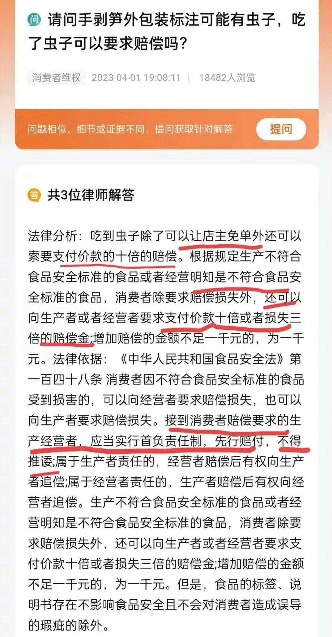 这个消息很快就在社交媒体上引起了轩然大波。人们纷纷对竹笋中出现竹虫的情况表示震惊和不满。有人认为这是商家在欺骗消费者,销售不安全的食品。建议提出索赔的要求,认为这是商品质量的问题,应该得到赔偿。