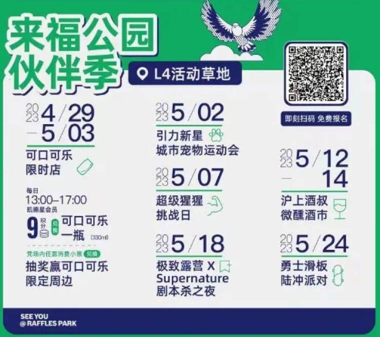 玩累了,你还可以去同楼层的来福公园放松休憩。刚刚完成升级改造的来福公园不仅完善了空间基础导示,体现公园之美,还打造了系列主题日,举办剧本杀之夜、可口可乐限时店等丰富场景活动,这让你游玩北外滩的方式又多了一种选择。