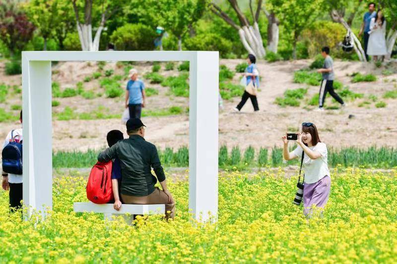 此外,北京温榆河公园朝阳示范区的油菜花海近期也开放了,沿着芸上梯田的步道拾级而上,油菜花漫山遍野。今年,公园还特别设置了拍照打卡景观装置。