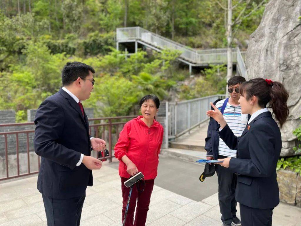 在高坪镇地心谷景区,红岩法庭工作人员与来往的游客沟通,了解他们的景区体验感,并告知他们在旅游过程中遇到各类纠纷及时寻求巡回法庭帮助。同时,红岩法庭工作人员对前来咨询群众提出的各种问题予以耐心细致的解答,在景区里开展了一次普法宣传。而后,法庭干警来到景区接待中心,与景区工作人员开展座谈,就加强景区安全管理提出了相应的建议,并表示将全力配合景区的工作。