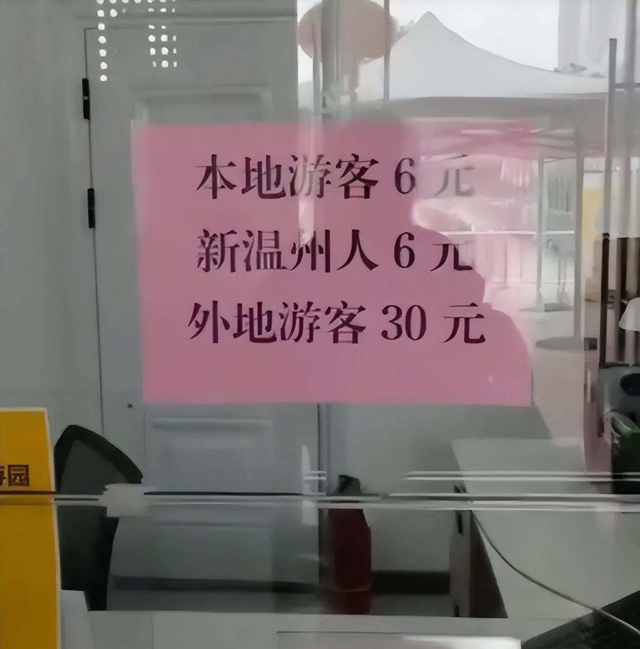 近日,到浙江温州旅游的王先生在看到景区售票处张贴的票价,这个景区的票价显示,本地游客和新温州人6元,外地游客30元,让王先生作为一个外地人,感觉非常的不舒服。认为外地人受到了区别对待,一点都不公平,有一种待宰的感觉,瞬间失去了游玩的兴致。
