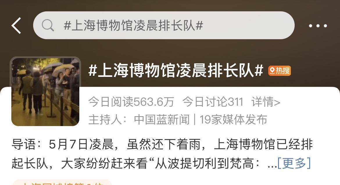7日上午,“上海博物馆凌晨排长队”话题冲上微博热搜。有网友在社交平台发布现场排长队照片,调侃道:“这是博物馆吗?这是迪士尼吧!”上海博物馆馆长褚晓波对记者表示:“今天白天的观众超过1万人次,晚上还有几小时,预计全天参观人数在13000到15000人次左右。”
