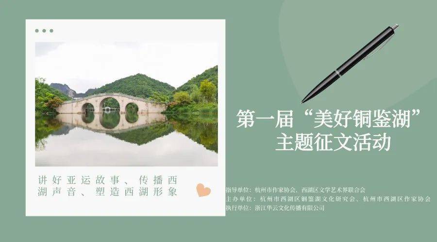 在杭州市作家协会、西湖区文学艺术界联合会指导下,西湖区铜鉴湖文化研究会联合 西湖区作家协会 、浙江华云文化传播有限公司共同举办第一届“美好铜鉴湖”主题征文活动。