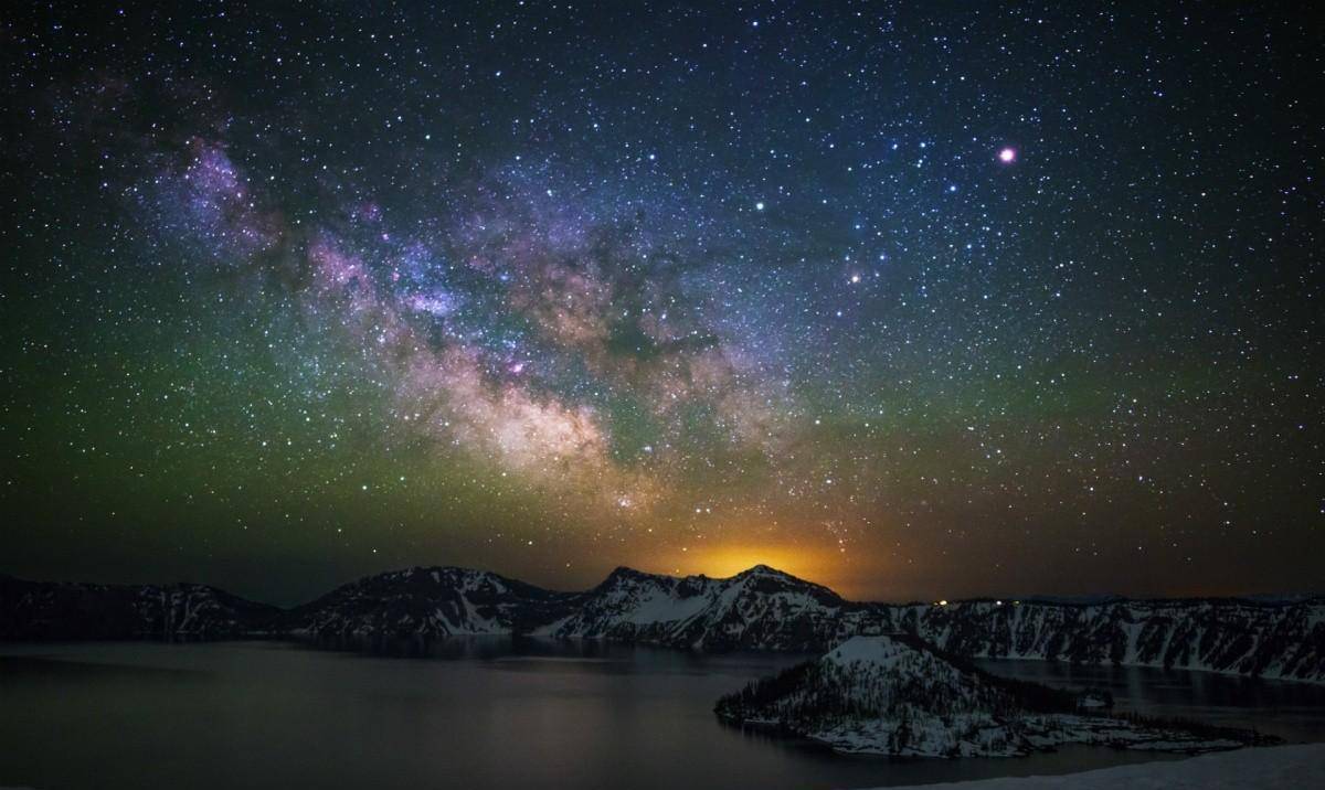 银河在火山口湖上方的夜空中闪闪发光