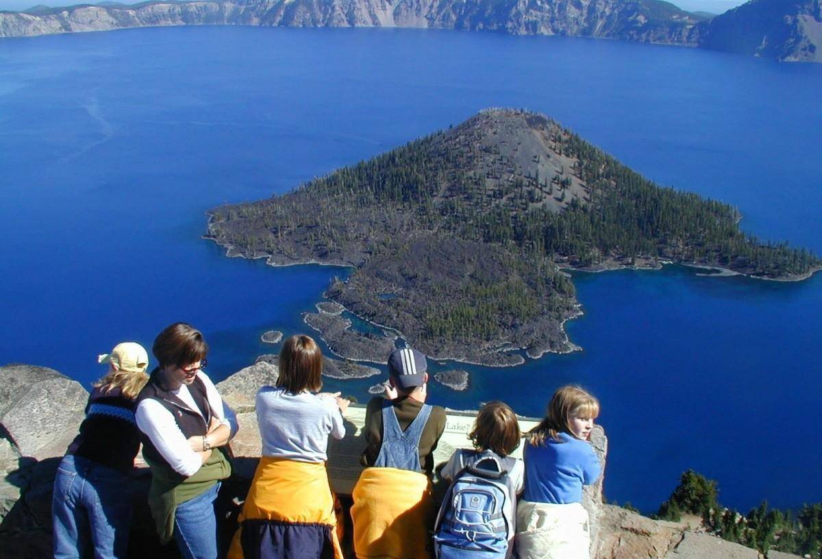 11. 令人毛骨悚然的岛屿从湖中升起。巫师岛是火山口湖中最大的。火山灰锥的遗迹,高出湖面 750 多英尺。夏季游客可以乘船游览巫师岛并徒步登顶。幻影船岛就停泊在湖岸边,大多数游客都不会注意到。虽然它像一艘小帆船,但该岛有 16 层楼那么高。它由抗侵蚀的熔岩构成,已有 40 万年历史,是火山口内最古老的裸露岩石。游客可以驾车前往幻影船观景台或徒步前往 Sun Notch,欣赏岛屿的美景。