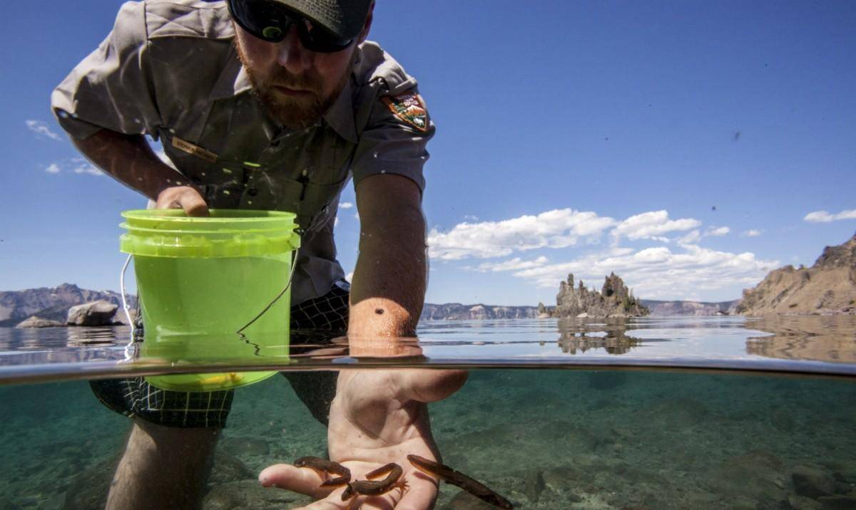 一名公园管理员在火山口湖放生马扎马蝾螈