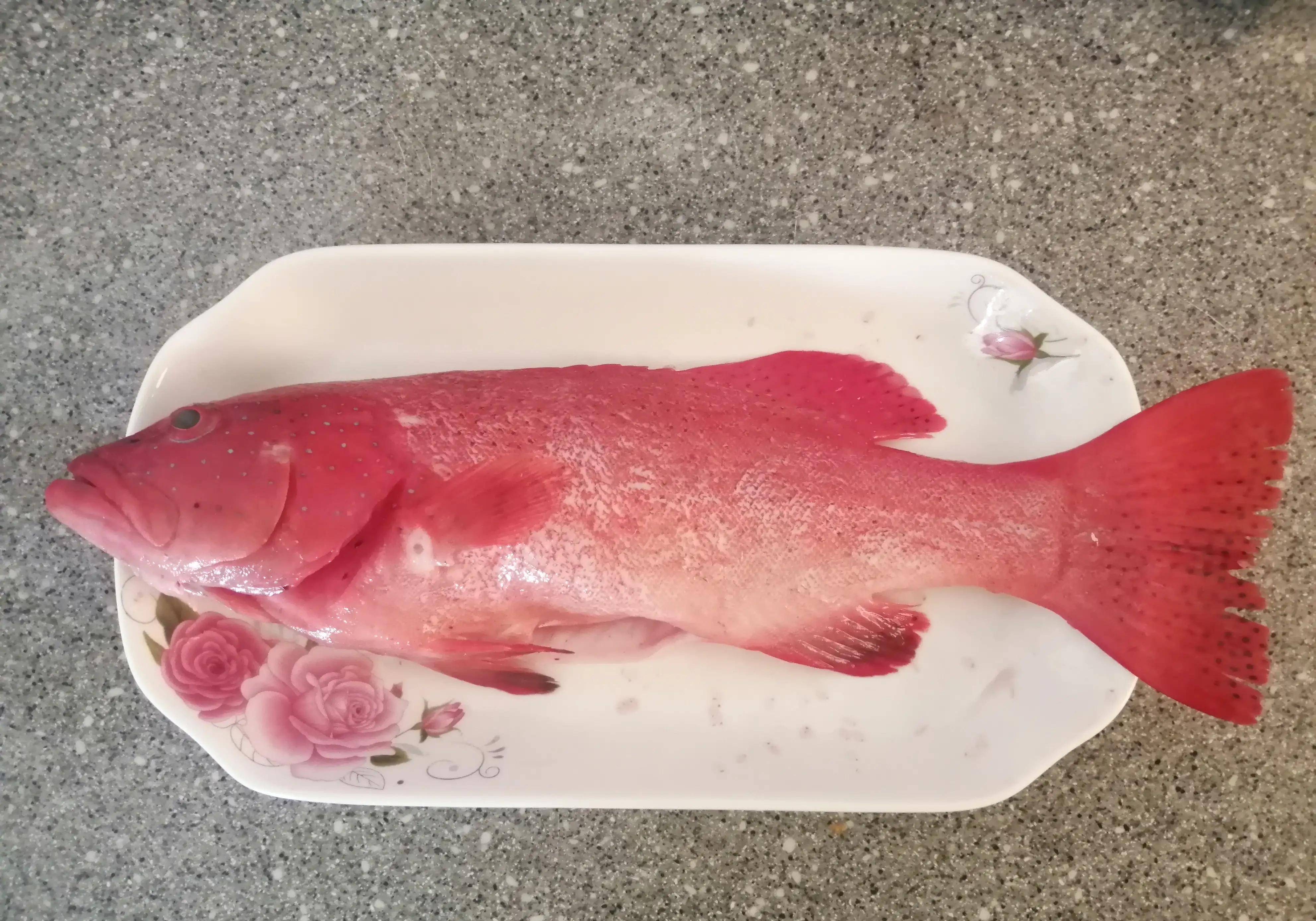 这是野生“东兴红石斑鱼”一斤二两多,砍到一百元。属高档鱼了。